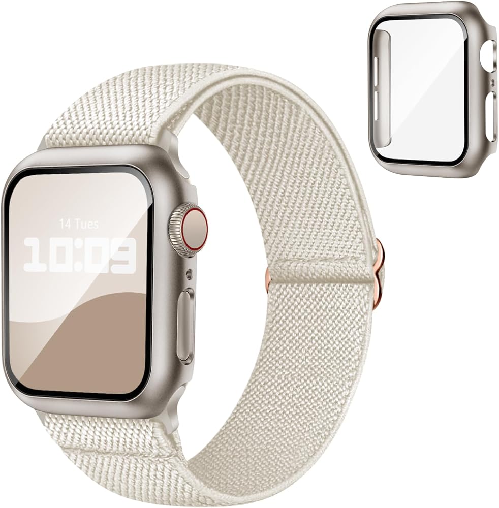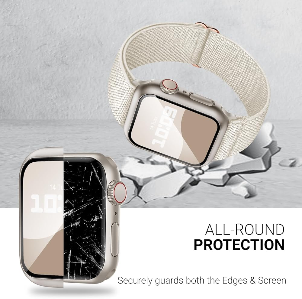 مجموعة 3 في 1: تشتمل هذه المجموعة على سوار ساعة أبل من النايلون، وحافظة لساعة أبل، وواقي شاشة لساعة أبل. تم تصميم المجموعة لساعة Apple Series SE SE2 9 8 7 6 5 4، لـ iWatch 40 مم 41 مم 44 مم 45 مم، مما يوفر حماية للشاشة والحافة.