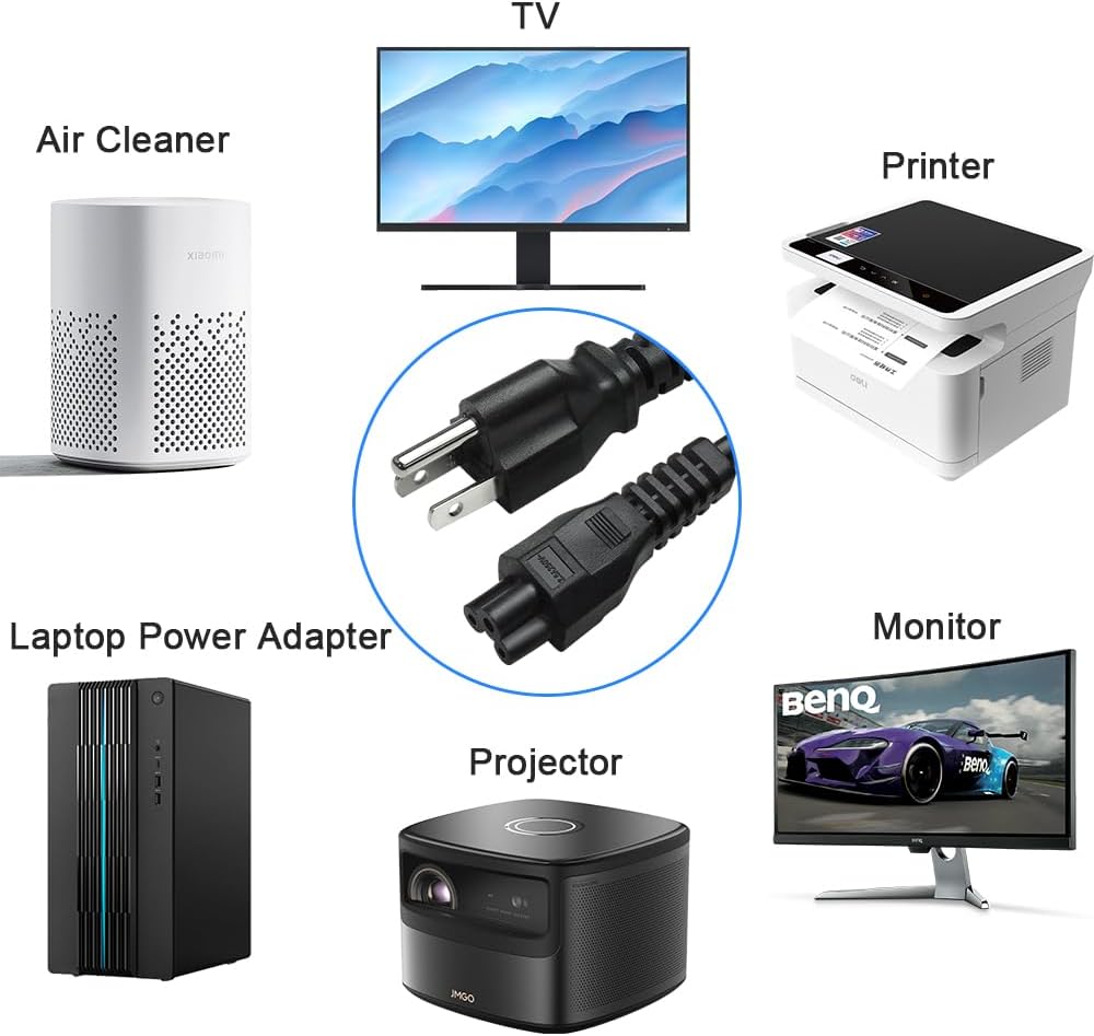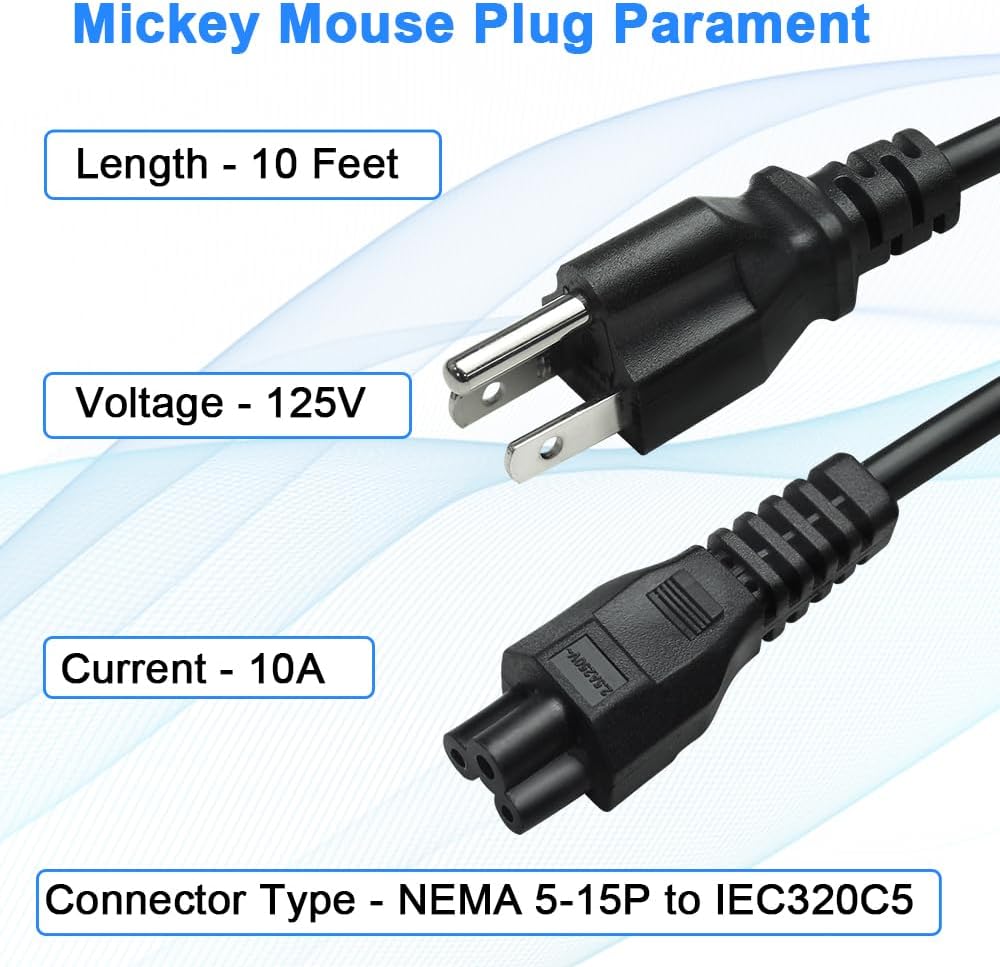 • AC Power Supply Cord: AC Power Supply Cable Mickey Mouse Universal Plug with 10ft 3 Prong 10A 125volt NEMA 5-15P to IEC320C5, SVT 3C X 18AWG(0.824mm2)