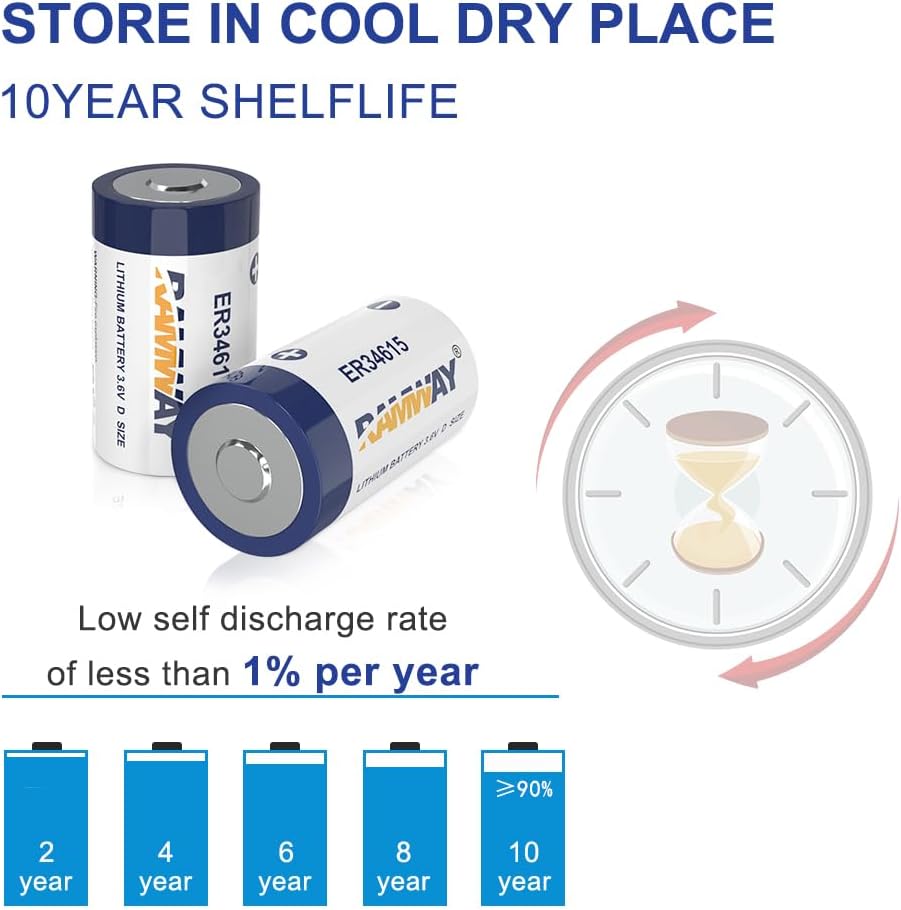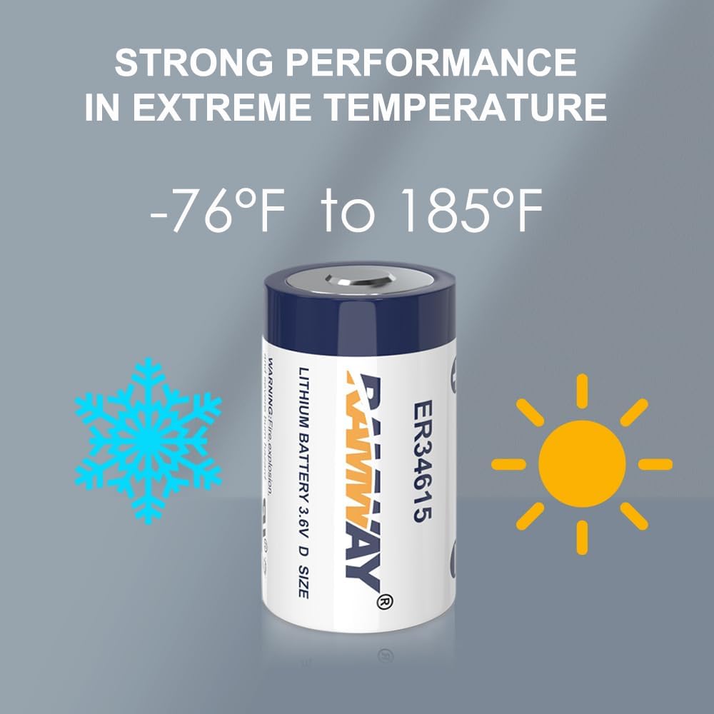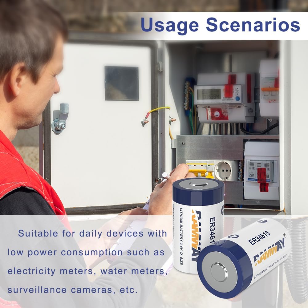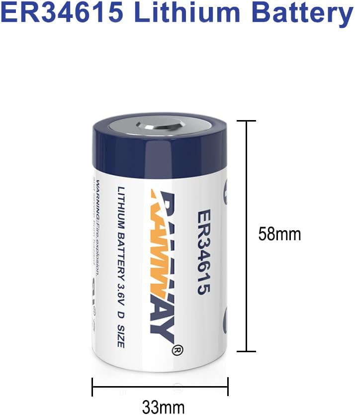 Battery Specification: 3.6V non-rechargeable D size Li-SOCL₂ battery, rated capacity 19000 mAh, max continuous discharge 230mA, wide range of temperatures -60°C to +85°C. This ER34615 battery is suitable for low electricity consumption devices.