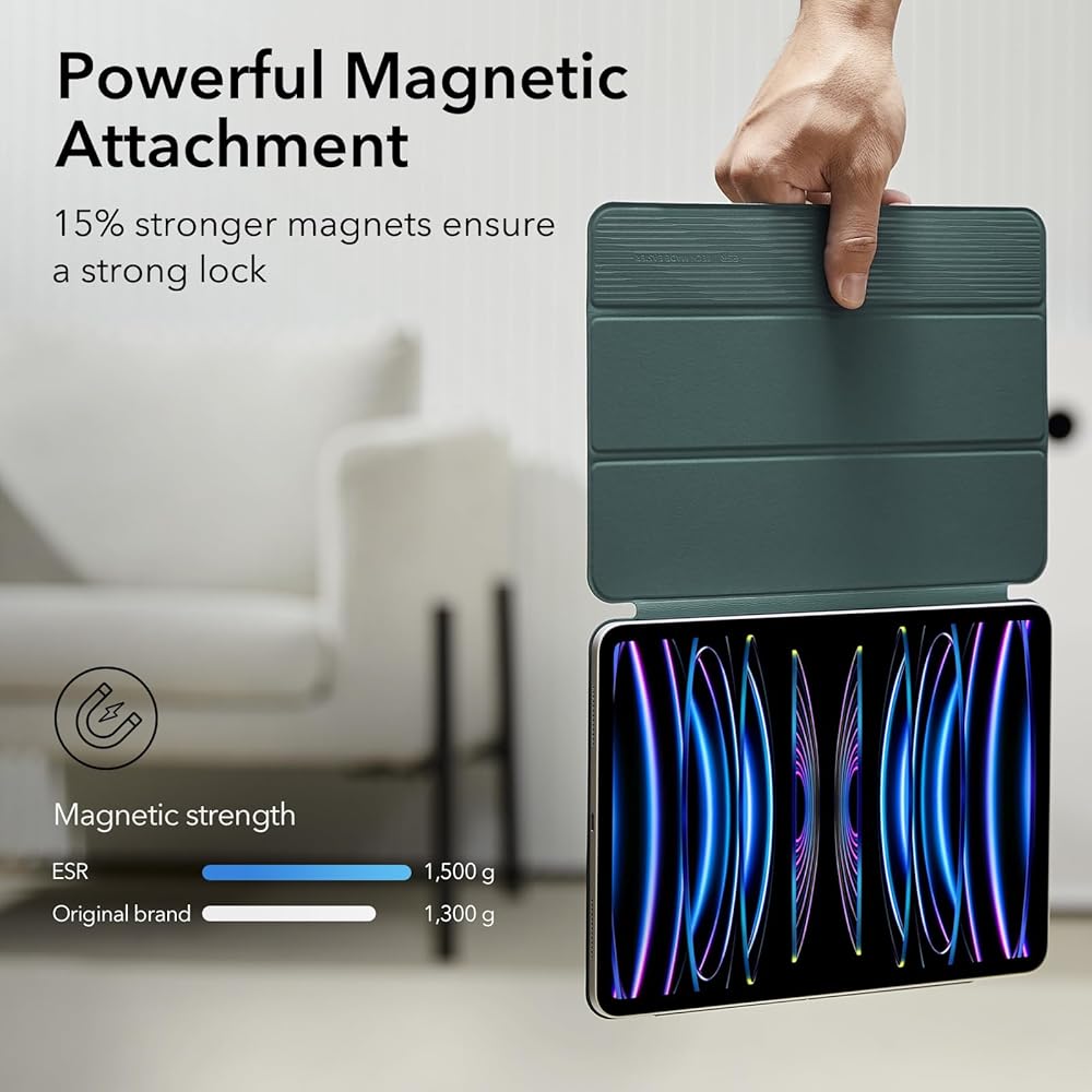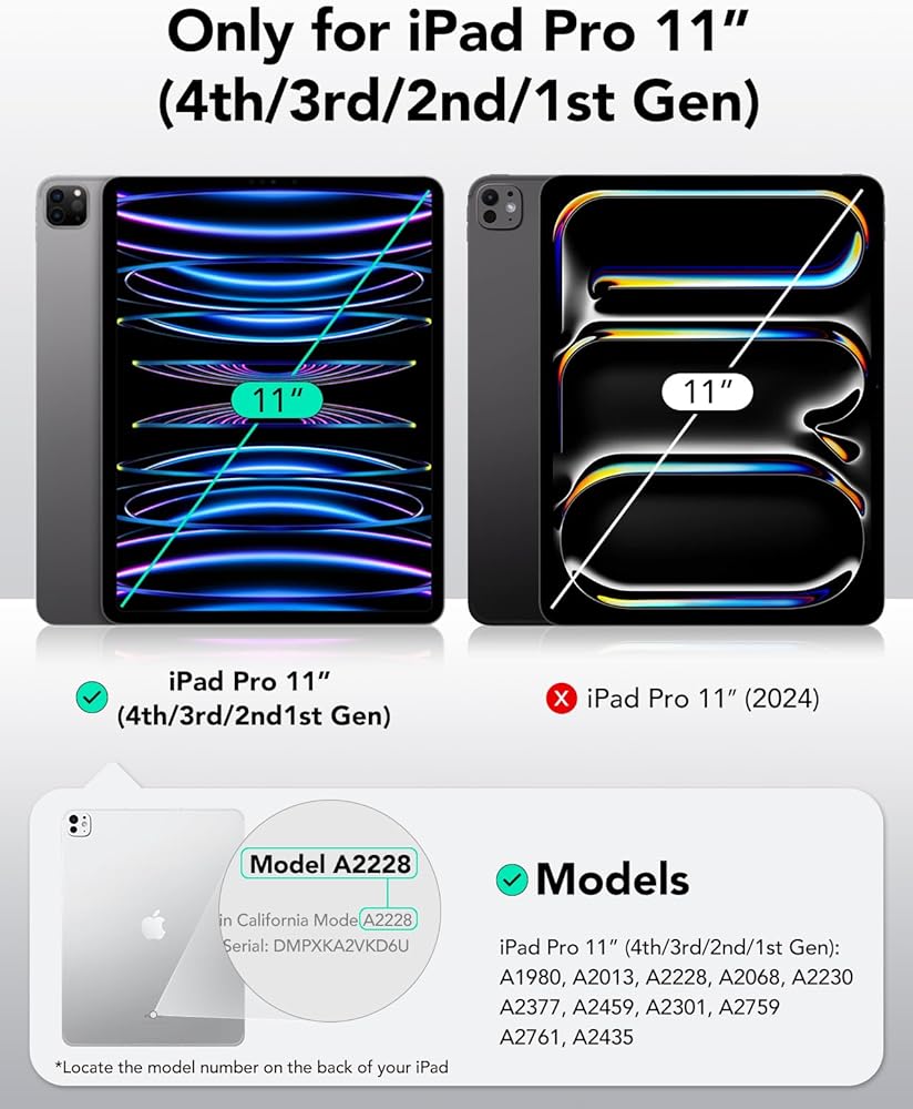 التوافق: متوافق فقط مع iPad Pro 11 بوصة (2022، الجيل الرابع)، وiPad Pro 11 بوصة (2021، الجيل الثالث)، وiPad Pro 11 بوصة (2020، الجيل الثاني)؛ الموديلات A2377، A2459، A2301، A2460، A2228، A2068، A2230، A2231