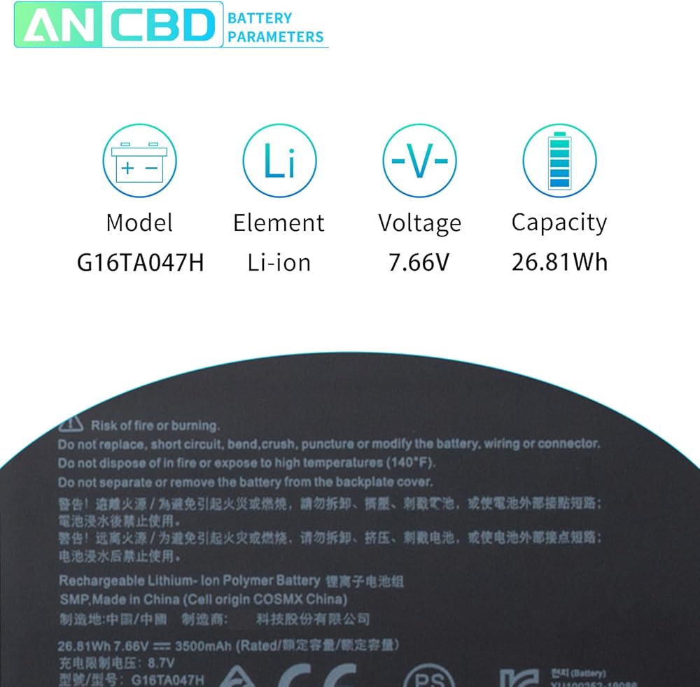 المواصفات: الجهد: 7.66 فولت السعة: 26.81 وات/3500 مللي أمبير في الساعة نوع البطارية: ليثيوم أيون الحالة: 100% جديدة تمامًا من الشركة المصنعة للموصل.