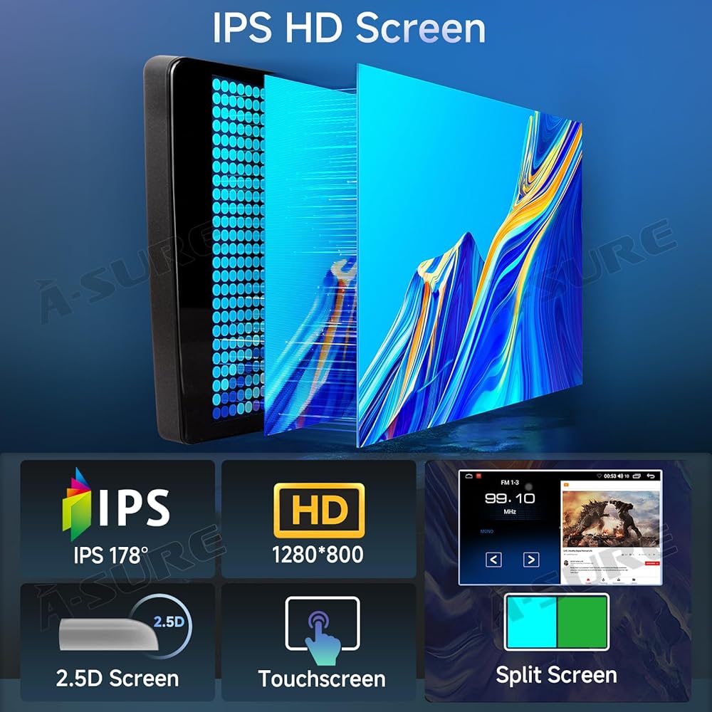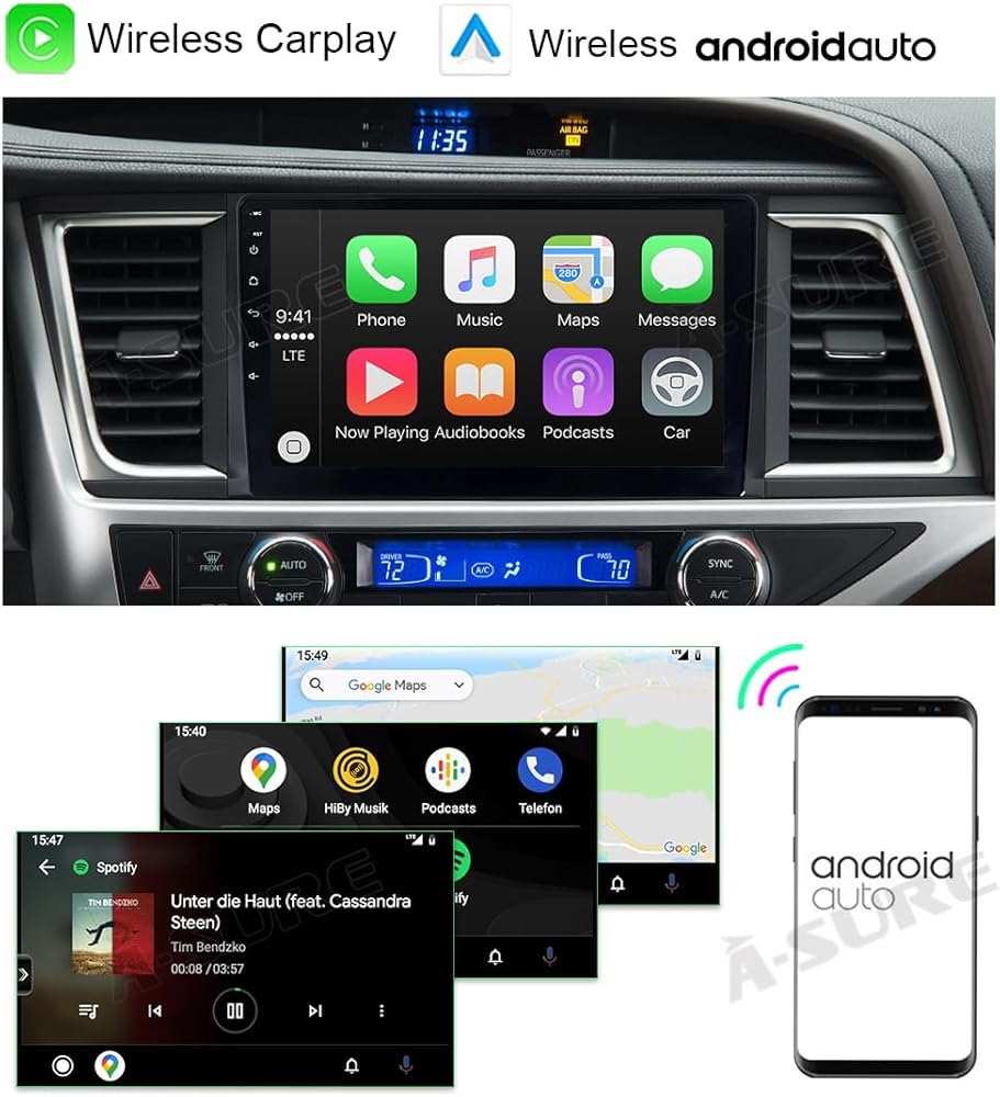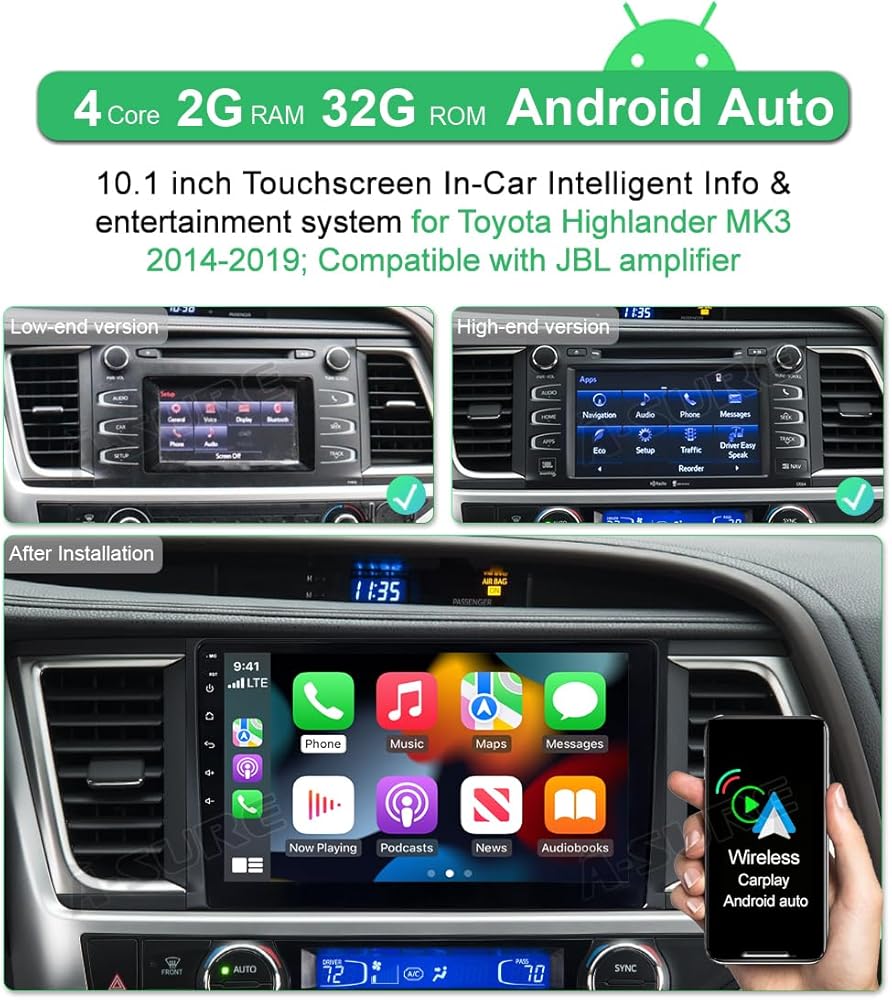 ASURE راديو ستيريو للسيارة مقاس 10.1 بوصة لسيارة Toyota Highlander 2014-2019، 4 Core 2G+32G Android وحدة ملاحة GPS للسيارة، 1280x800 HD Wireless Carplay Android Auto Touchscreen مشغل الوسائط المتعددة