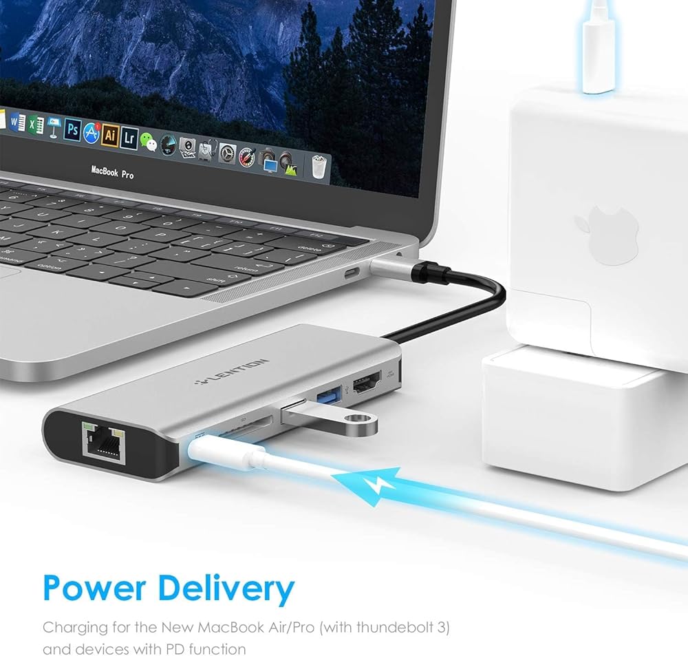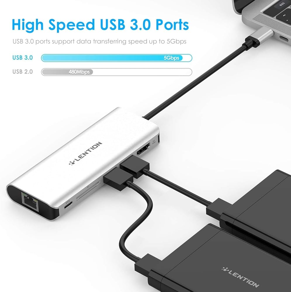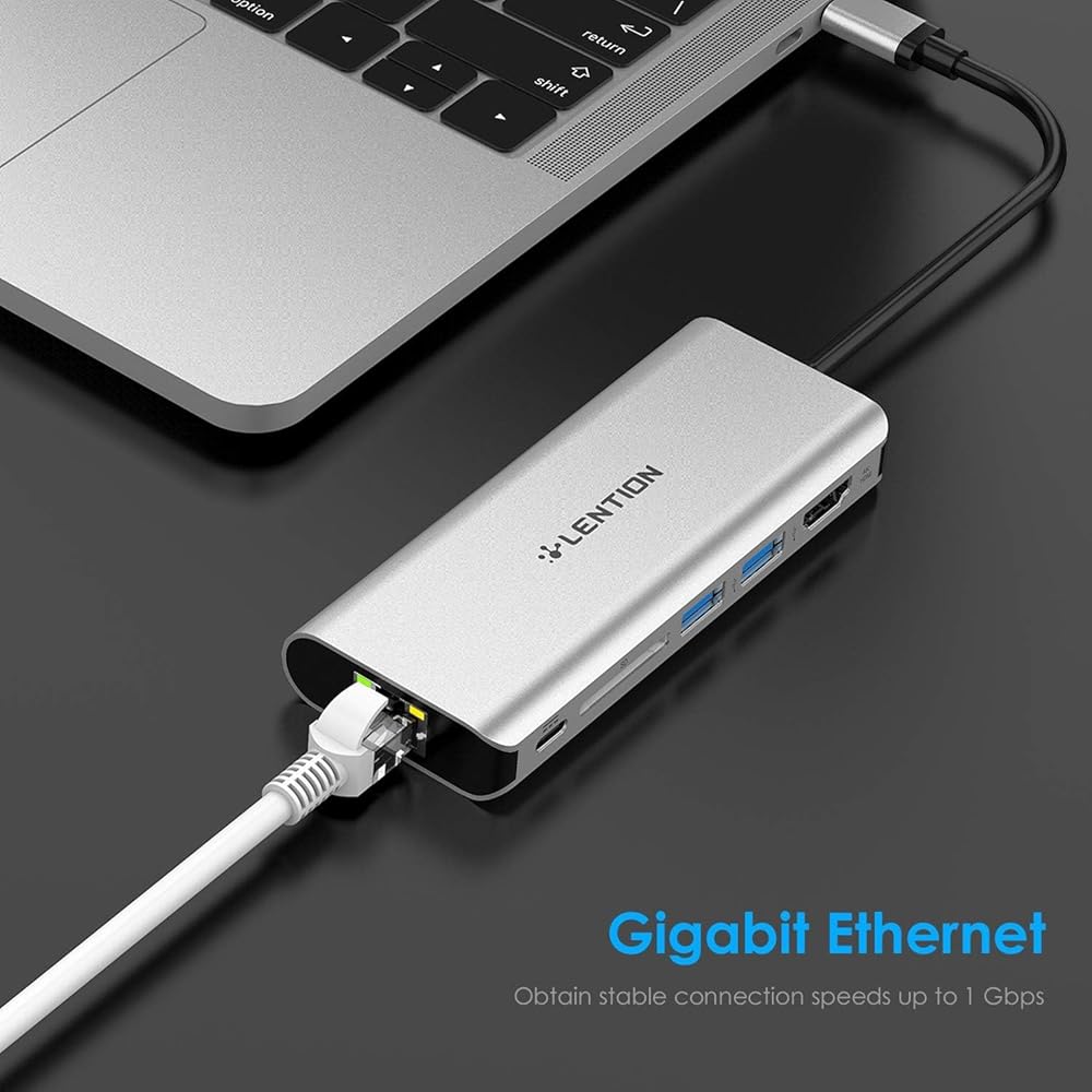 الشحن السريع والإيثرنت: يمكن لمنفذ الشحن من النوع c المرور عبر طاقة تصل إلى 60 وات إلى أجهزة توصيل الطاقة USB-C. يوفر محول Gigabit LAN اتصالاً كاملاً بشبكة سلكية فائقة الاستقرار بسرعة 10/100/1000 ميجابت في الثانية