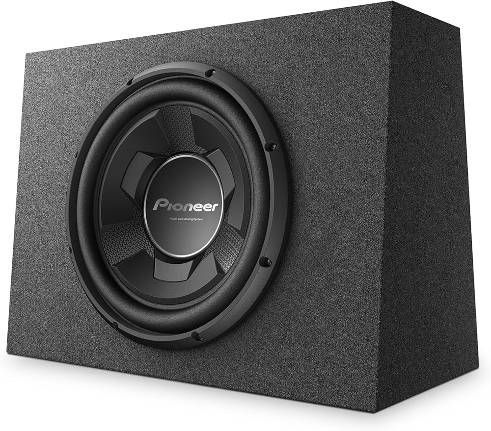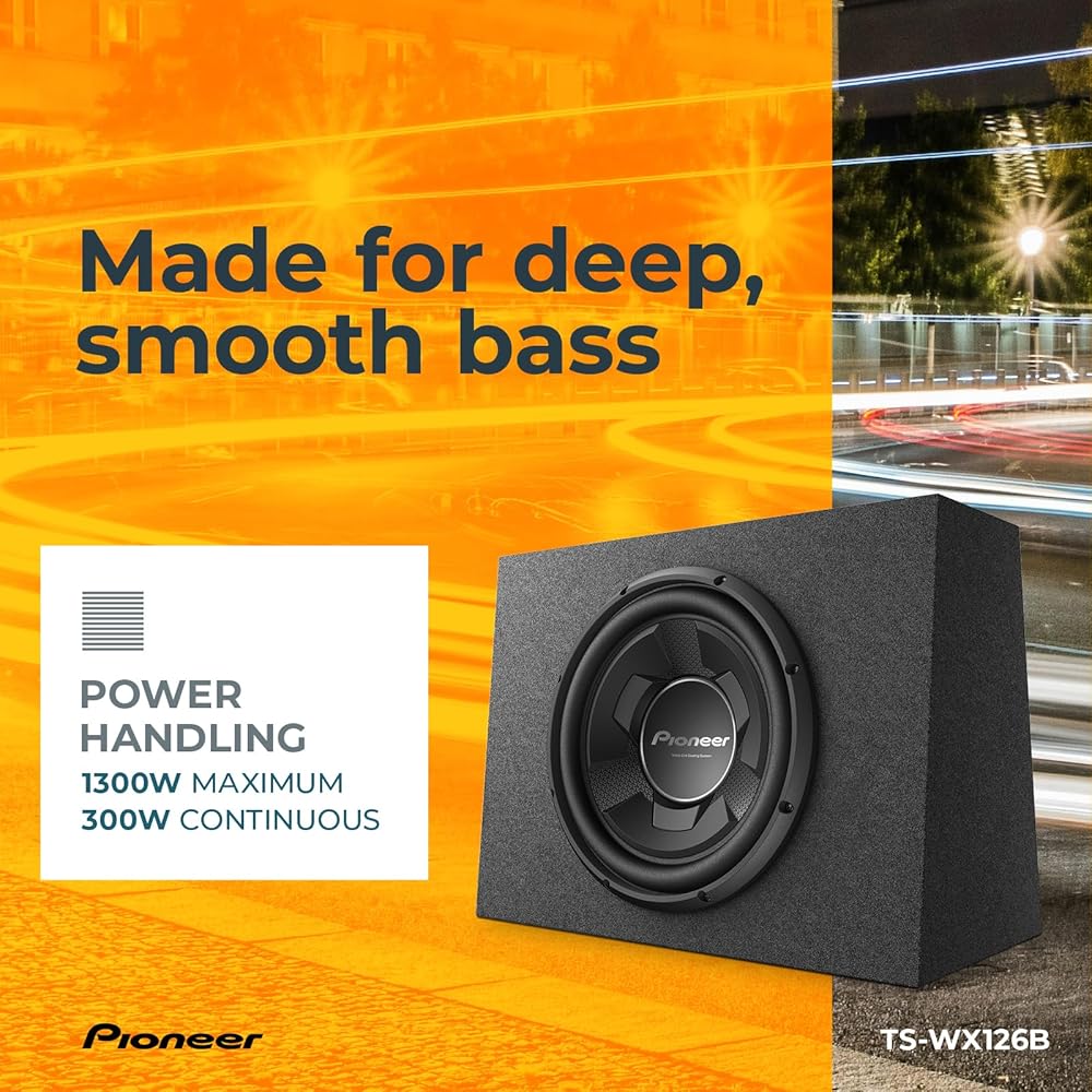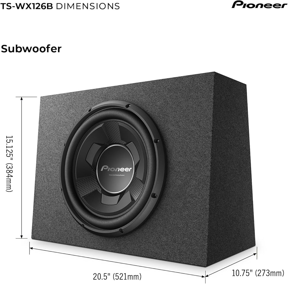 Discover the power of the Pioneer TS-WX126B, our small but mighty 12" compact subwoofer speaker, designed for superior audio performance. Featuring a lightweight polymide tweeter diaphragm and a uniquely shaped wave guide, this system ensures clear vocals and wide dispersion for natural sound delivery. Enhance your car stereo audio experience by connecting to an external amplifier, leveraging the 4Ω Single Voice Coil (SVC) design for straightforward wiring and reliable performance. The Voice Coil Cooling System (VCCS) maintains optimal temperatures during high-volume use, preserving sound quality and extending durability. Its trapezoid shape reduces internal standing waves, increases rigidity, and offers flexible installation options under seats or in cabins, with choices for rear, front, or upward firing configurations. Fully carpeted for scratch resistance and durability, the TS-WX126B guarantees non-slip performance in any setup. Upgrade your car speaker system today, and enjoy the deep, rich bass the Pioneer TS-WX126B has to offer.