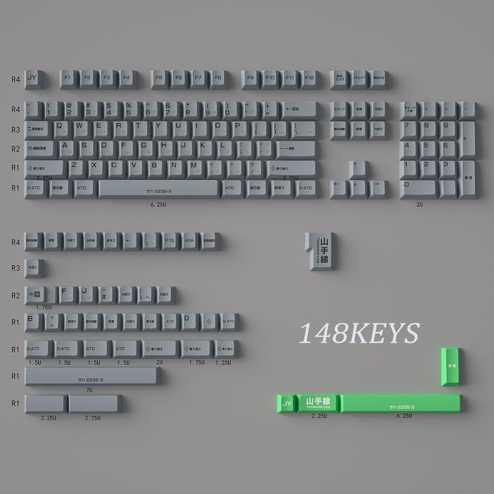 أغطية مفاتيح Janpanese باللون الرمادي والأخضر، 148 مفتاحًا PBT Keycaps 75 بالمائة، مجموعة أغطية مفاتيح مخصصة للوحة المفاتيح لملف تعريف الكرز لتخطيط ASIN/ISO