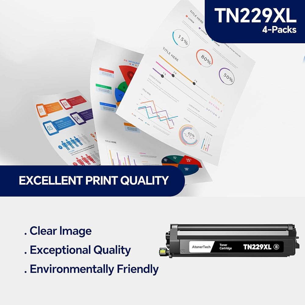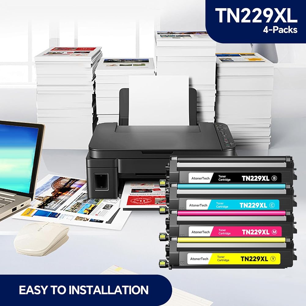 • AtonerTech TN229XL 4 عبوات لخراطيش الحبر Brother TN229XL 4 عبوات (TN229XXL)، بما في ذلك TN-229XL أسود، TN229XL سماوي، TN 229XL أصفر، TN 229 أرجواني