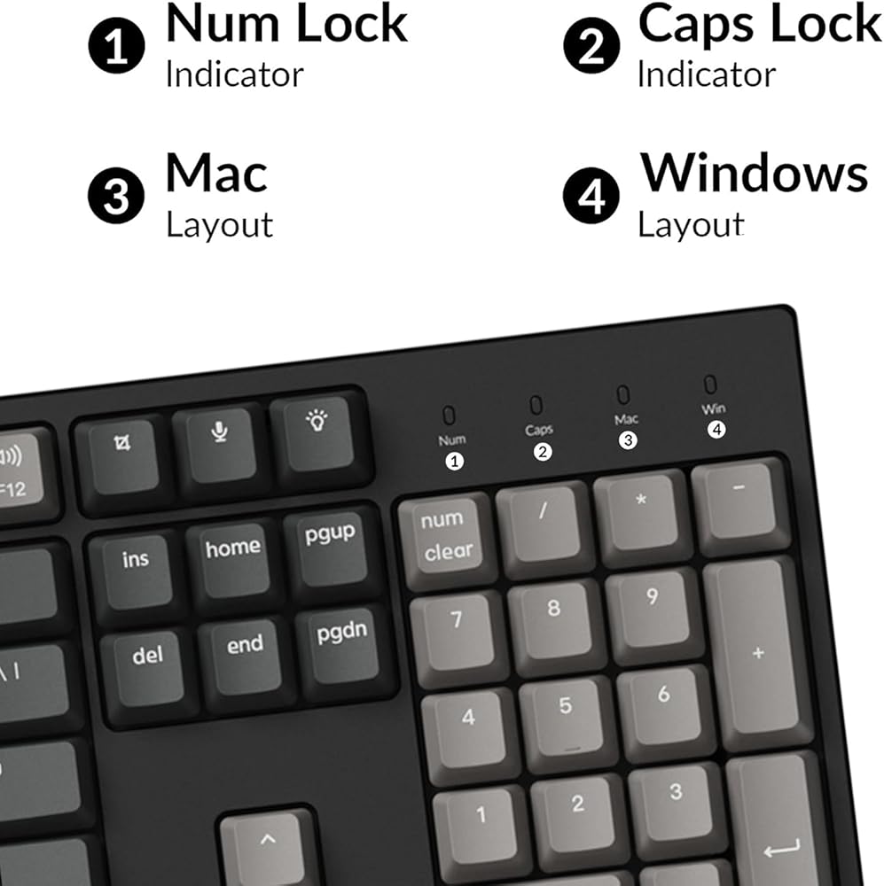 تبديل التخطيطات بين نظامي التشغيل macOS وWindows - تم تصميم Keychron C2 Pro مع وضع تجربة مستخدمي Mac في الاعتبار مع الحفاظ على التوافق مع أجهزة Windows، ويأتي مزودًا بتبديل النظام ومجموعة إضافية من أغطية المفاتيح المخصصة لكل من أنظمة Windows وmacOS. يمكنك الآن حفظ تخطيطين مختلفين على لوحة المفاتيح، واحد لكل نظام.