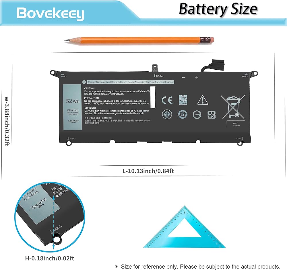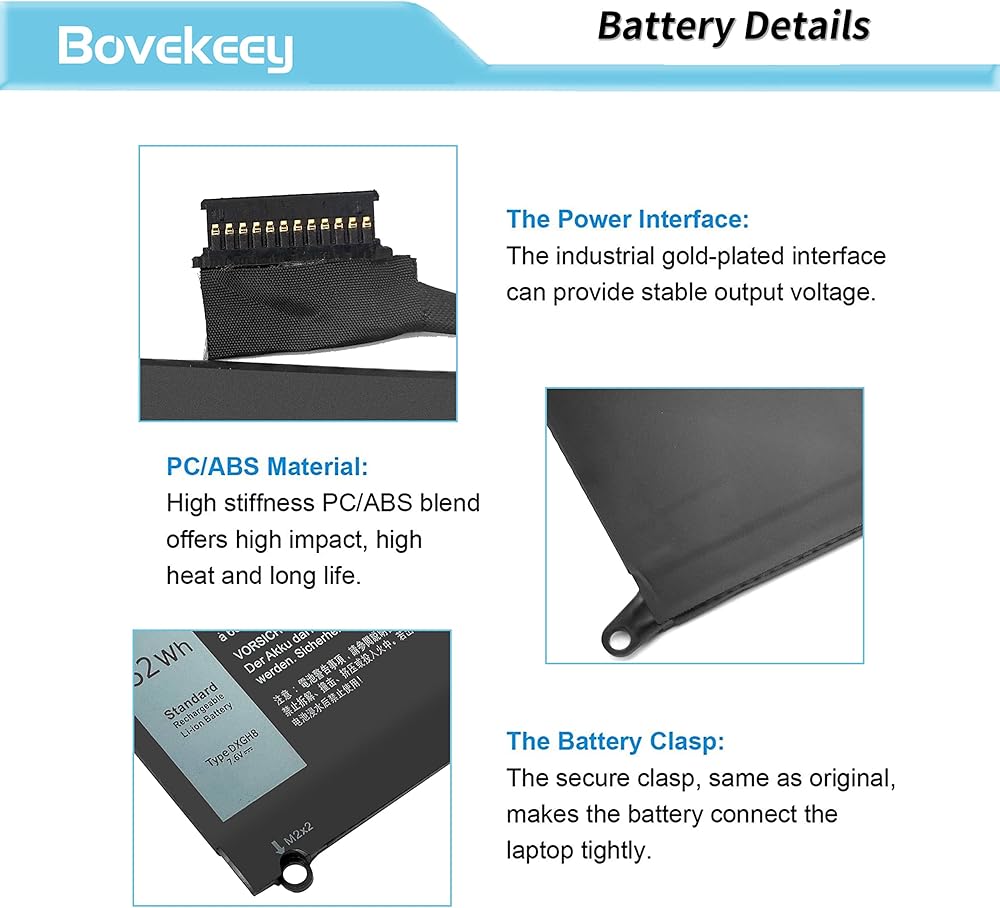 【تفاصيل البطارية】- بطارية xps 13 9370 البديلة هي اسم الطراز: بطارية ليثيوم أيون قياسية قابلة لإعادة الشحن من النوع DXGH8؛ نوع البطارية: ليثيوم أيون؛ الجهد: 7.6 فولت؛ السعة: 52 وات في الساعة؛ الخلايا: 4 خلايا؛ الحالة: جديد؛ العمر الافتراضي: حوالي 300-500 تفريغ لكل دورة شحن، الوزن: حوالي 12 أونصة.
