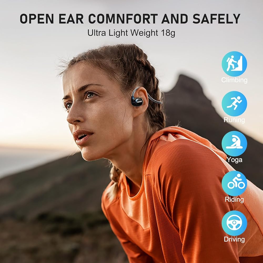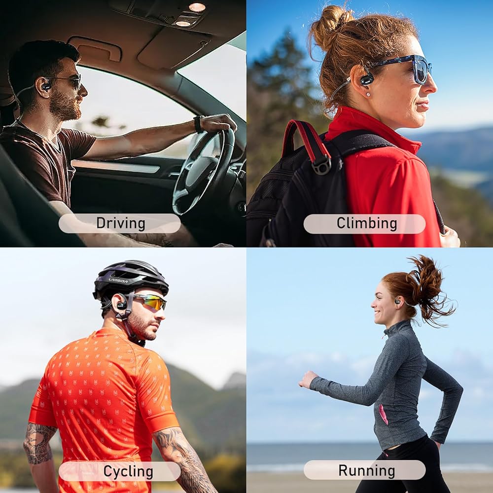 راحة الأذن المفتوحة مع تقنية توصيل الهواء: بدلاً من التصميمات التقليدية داخل الأذن أو فوق الأذن، تنقل سماعة الأذن المفتوحة بلوتوث الصوت عبر الهواء، مما يوفر وضوحًا استثنائيًا دون حجب أذنيك، مما يضمن أنك تستطيع الاستمتاع بالموسيقى أو المدونات الصوتية أثناء البقاء على دراية بالبيئة المحيطة بك، وهو أمر مهم بشكل خاص للأنشطة الخارجية مثل الجري أو ركوب الدراجات، مما يعزز السلامة. يزن 18 جرامًا فقط وهو خفيف الوزن بشكل لا يصدق. بالكاد ستلاحظ أنك ترتديها.