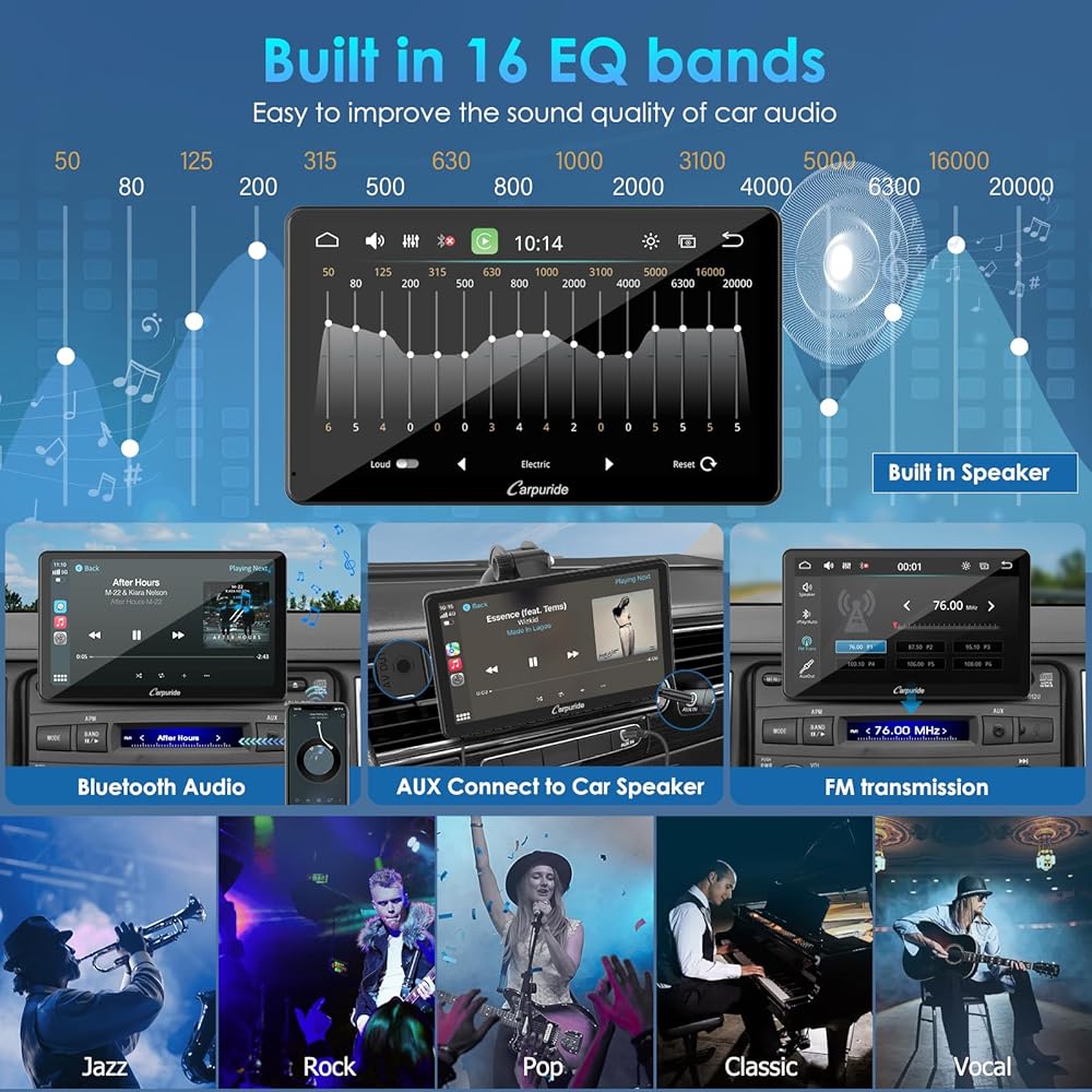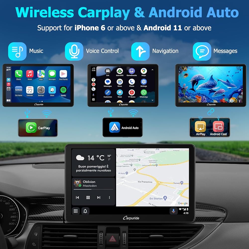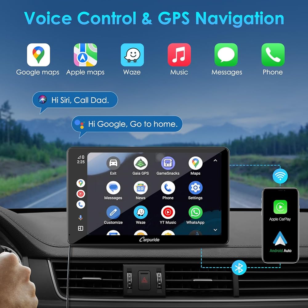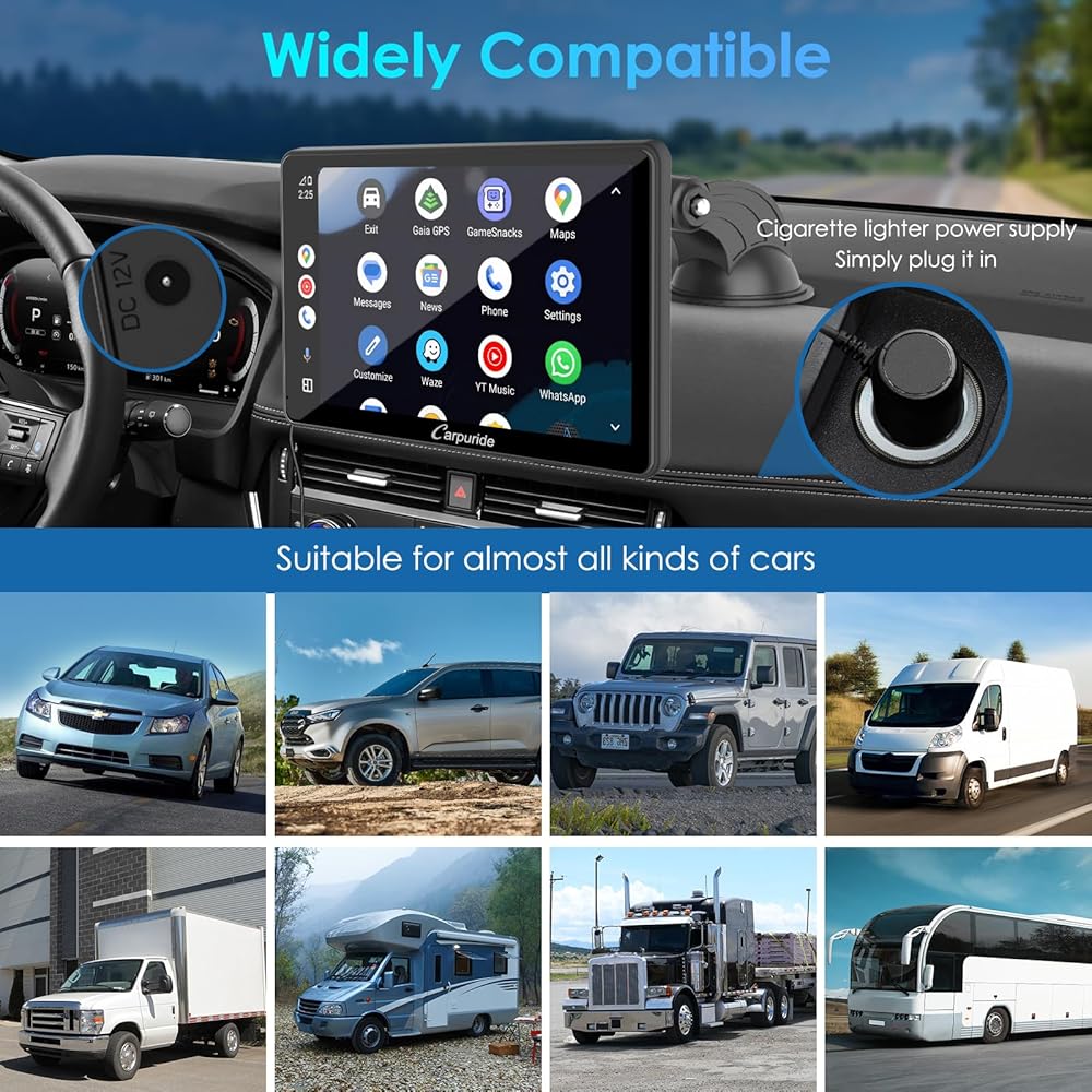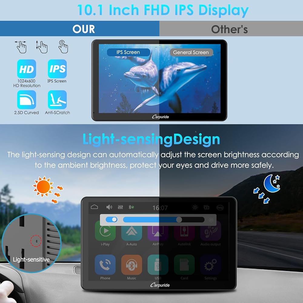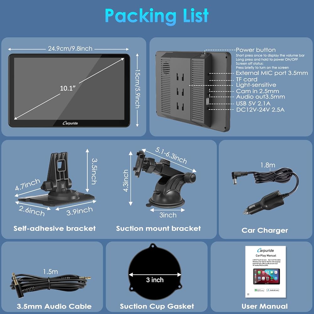 Why choose Carpuride 101 portable wireless apple carplay android auto? -It's an easy way to upgrade your car's audio system without having to get a new car. -Great Car play without need of removing or modifying your current Stereo system. -Saves a lot of money than adding a head unit and doing all the wiring and getting a bill of easily over a grand. -The 10.1 inch touch screen makes the unit more modern and sleek. -Automatic brightness adjustment and 10 levels of manual brightness adjustment using the light sensor. Specification: CarPlay and Android Auto: Take calls, listen to music, or real-time navigation, and more. Bluetooth Feature: Support Bluetooth music and hands-free calls. Voice Controls: Support Apple Siri and Android voice control. USB Charger Port: 5V 2.1A output to charge cellphones. Easy to Install: 3 minutes to do, no skills are required. FM Transmitting: Connect into car audio by FM transmitting sounds. AUX Output: Support AUX port transmission. Operating Voltage: 12V - 24V voltage Power Supply: Cigarette lighter port Screen: 2.5HD ,10.1 “IPS material Package List: Car stereo radio main engine * 1 Self-adhesive bracket * 1 Car charger * 1 3.5mm AUX cable * 1 User manual * 1