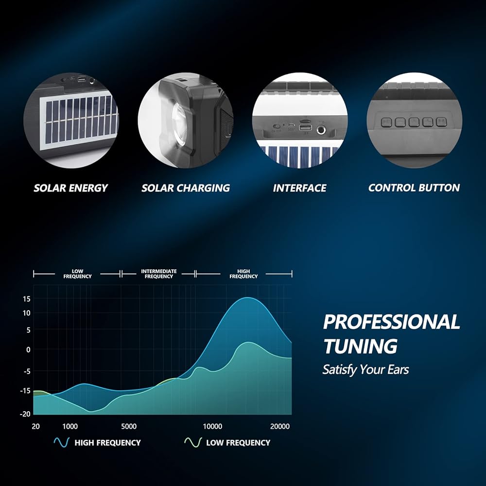 • Solar-Powered: Harness the power of the sun to keep the music playing wherever you go. The integrated solar panel effortlessly charges the speaker, ensuring you stay connected without worrying about running out of battery.