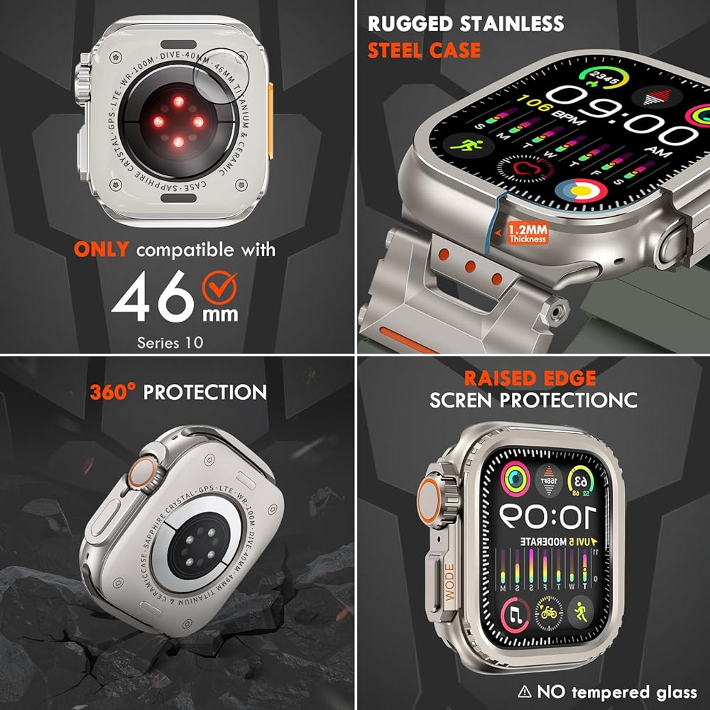 STAINLESS STEEL CASE PROTECTION : The apple watch protector 49mm features a raised edge that guards against scratches. The ceramic-like plastic back cover ensures comprehensive protection without affecting touch sensitivity or moisture retention. The 1.2mm raised edge of the bumper case deflects impacts and prevents scratches, all while maintaining full touchscreen functionality. (Note: Tempered glass not included.)