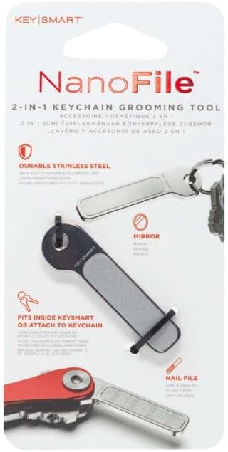 STAY FLAWLESS &  GROOM ON-THE-GO! Quickly fix a broken nail or check your appearance with this premium nail file and mirror accessory. The NanoFile fits perfectly inside your KeySmart or on your keychain. One side features a high-quality mirror while the other side has a stainless steel nail file, making it the perfect grooming tool for your keychain. STAINLESS STEEL NAIL FILE - Premium fine grit nail file is made with durable stainless steel so that it will last for years, no matter how often you need to fix a broken nail. HIGH QUALITY MIRROR - Clear and balanced mirror provides an accurate reflection so you can quickly and discreetly check your appearance wherever you are. ATTACH TO KEYSMART OR KEYCHAIN- Includes a hole to easily attach it to your keychain or KeySmart for quick access.Â