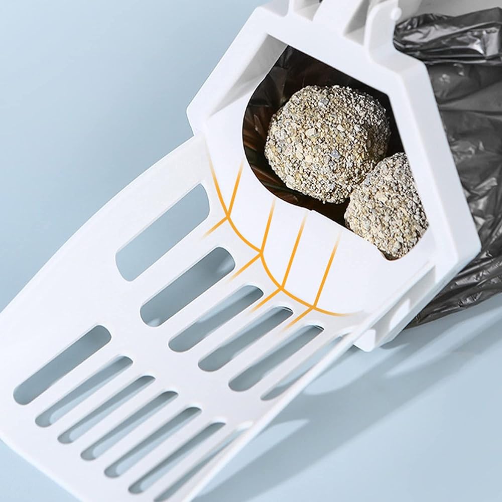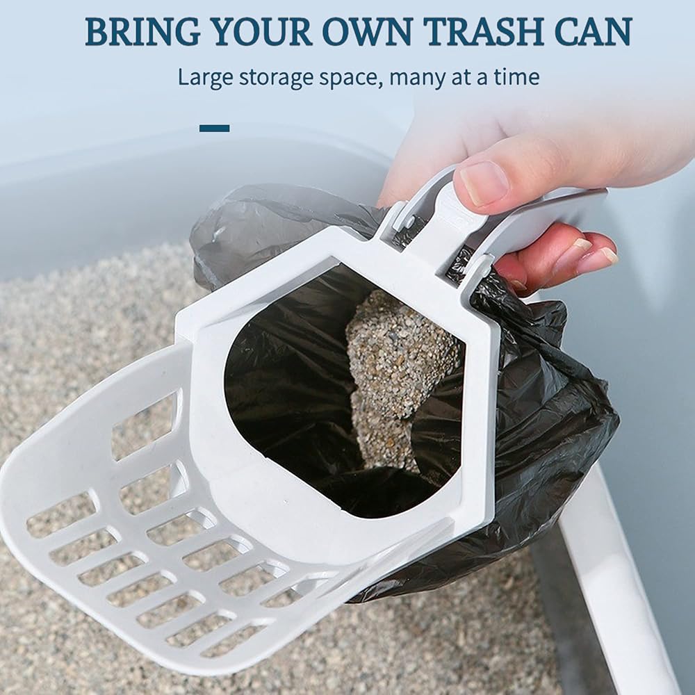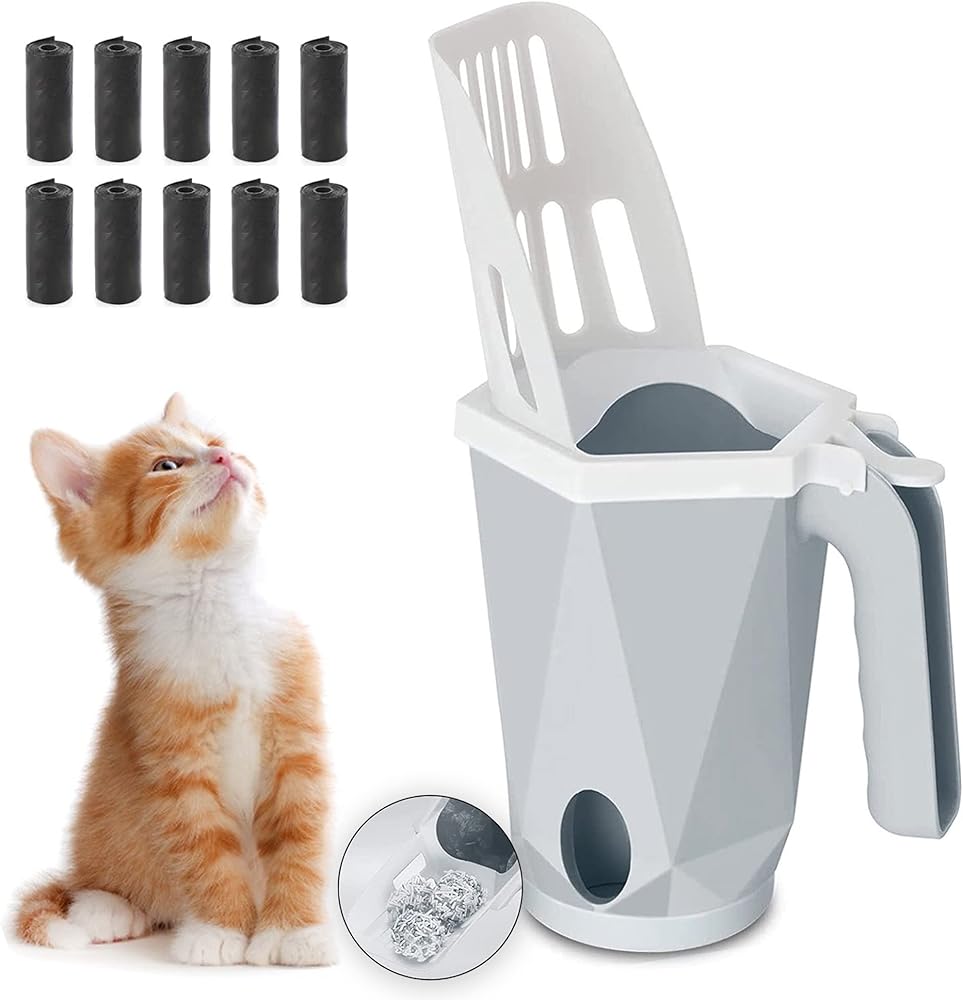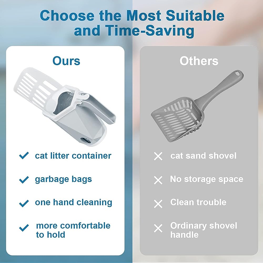 مجرفة فضلات القطط 2 في 1: ربط مجرفة فضلات القطط مع حامل وأكياس يجعل من السهل تنظيف ما يوجد في صندوق الفضلات، وتعبئتها تلقائيًا وإزالة الكيس بعد ذلك، مما يترك يديك نظيفتين. ليس من الصعب استخدامها بيد واحدة، مما يجعل التنظيف اليومي أكثر قوة.