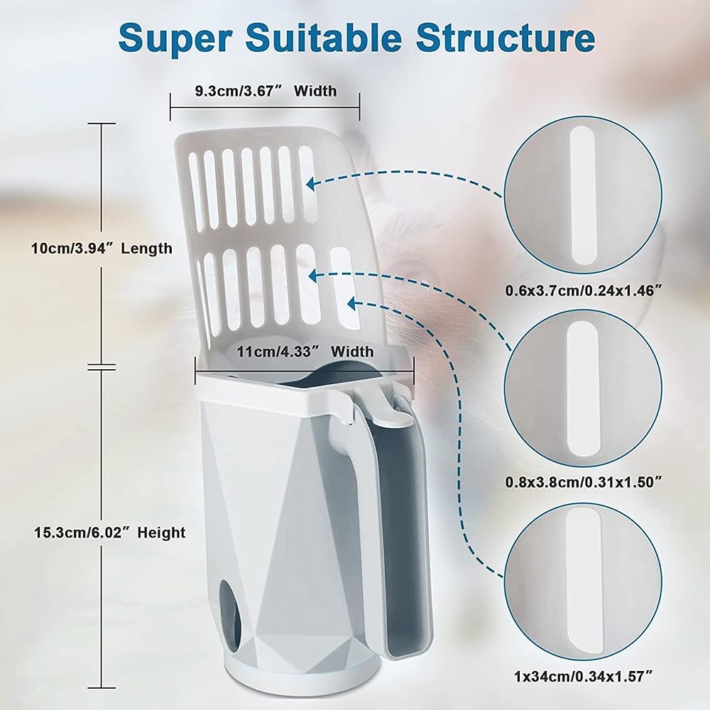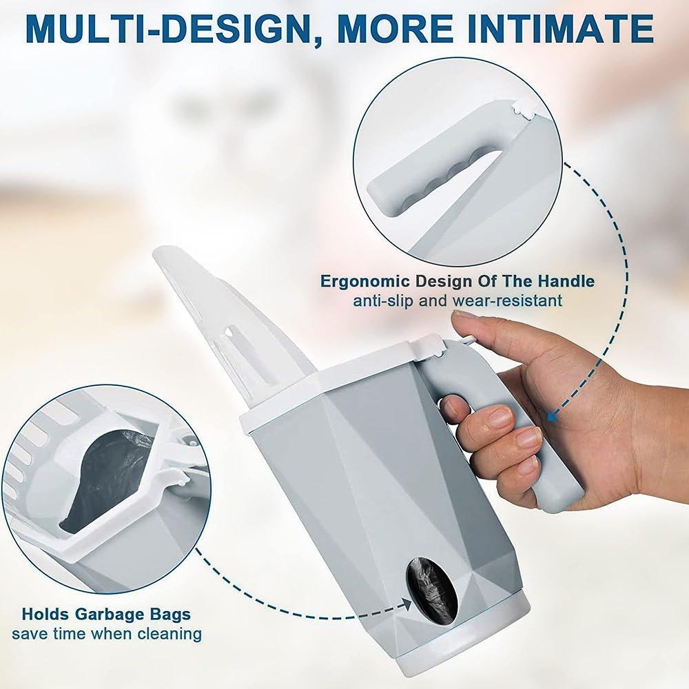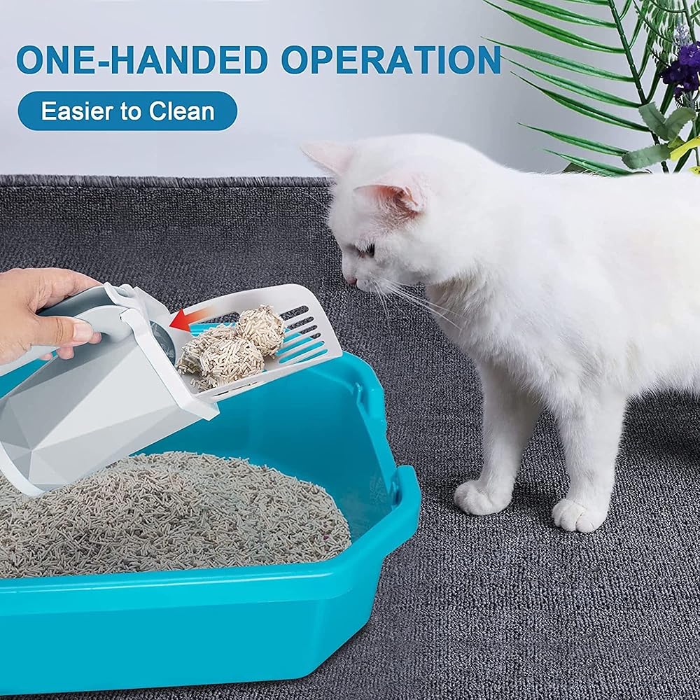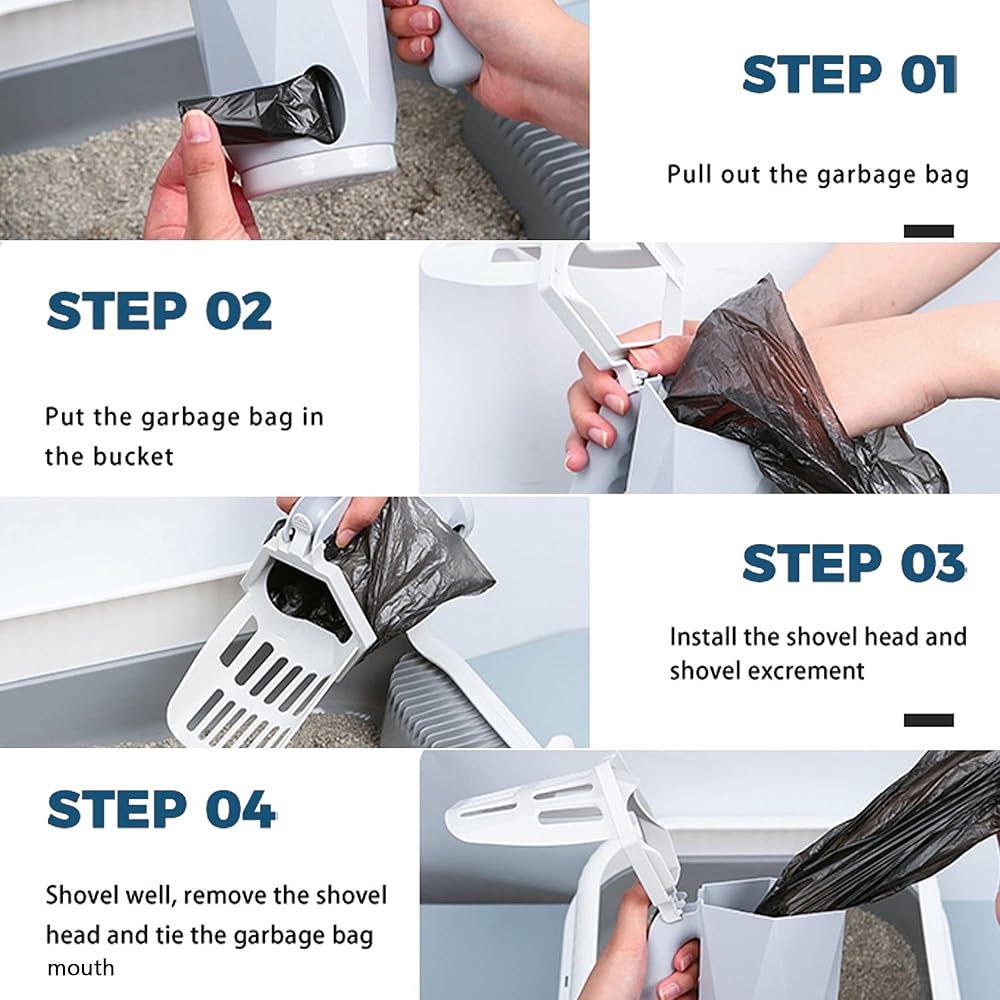 مجرفة فضلات القطط 2 في 1: ربط مجرفة فضلات القطط مع حامل وأكياس يجعل من السهل تنظيف ما يوجد في صندوق الفضلات، وتعبئتها تلقائيًا وإزالة الكيس بعد ذلك، مما يترك يديك نظيفتين. ليس من الصعب استخدامها بيد واحدة، مما يجعل التنظيف اليومي أكثر قوة.