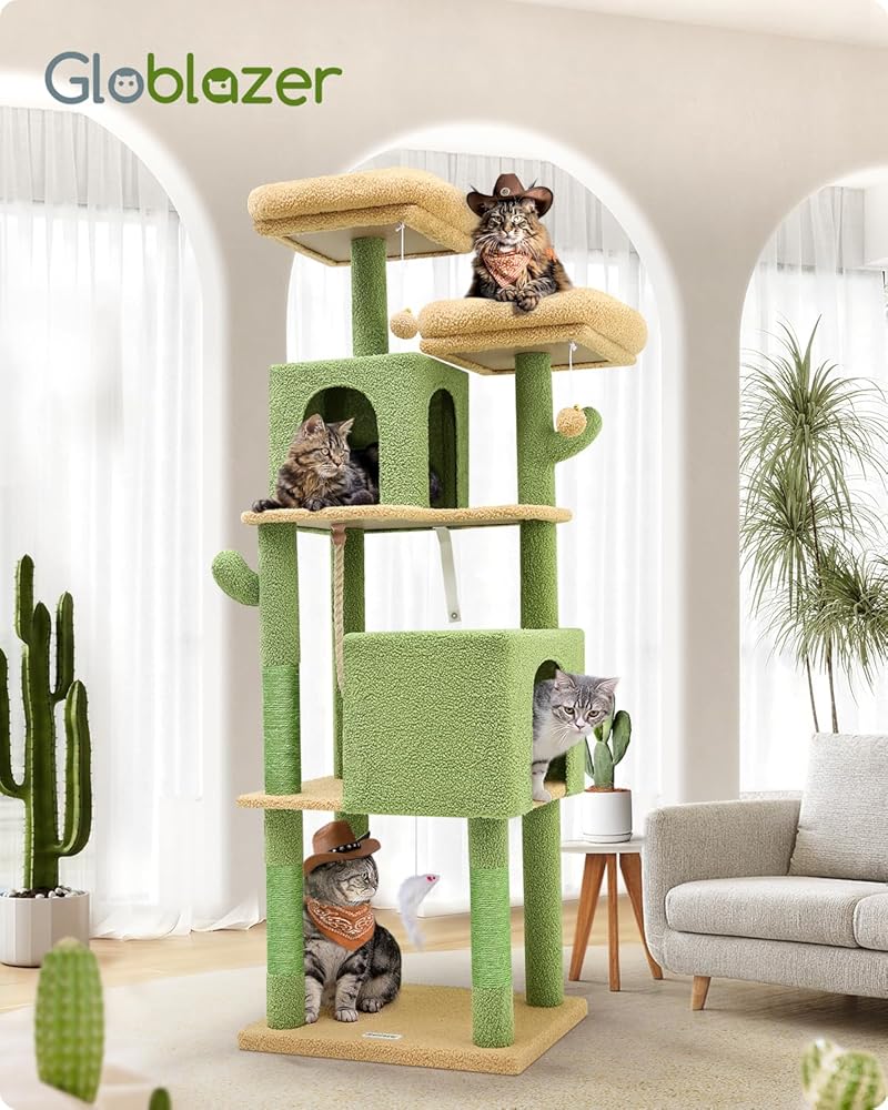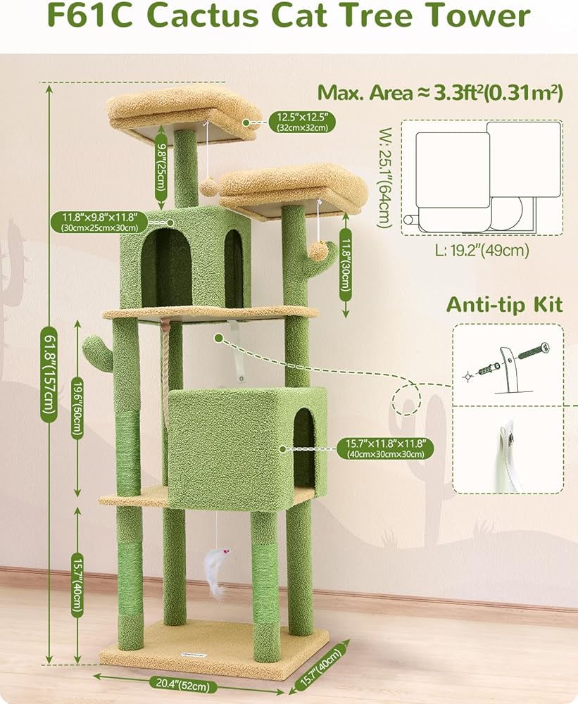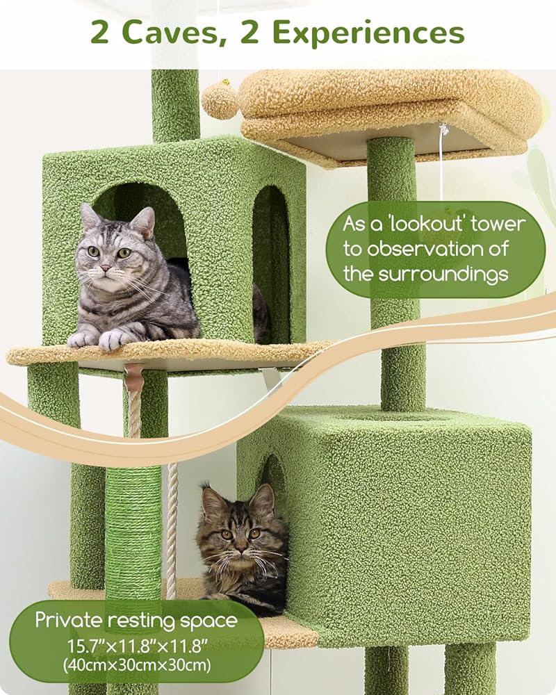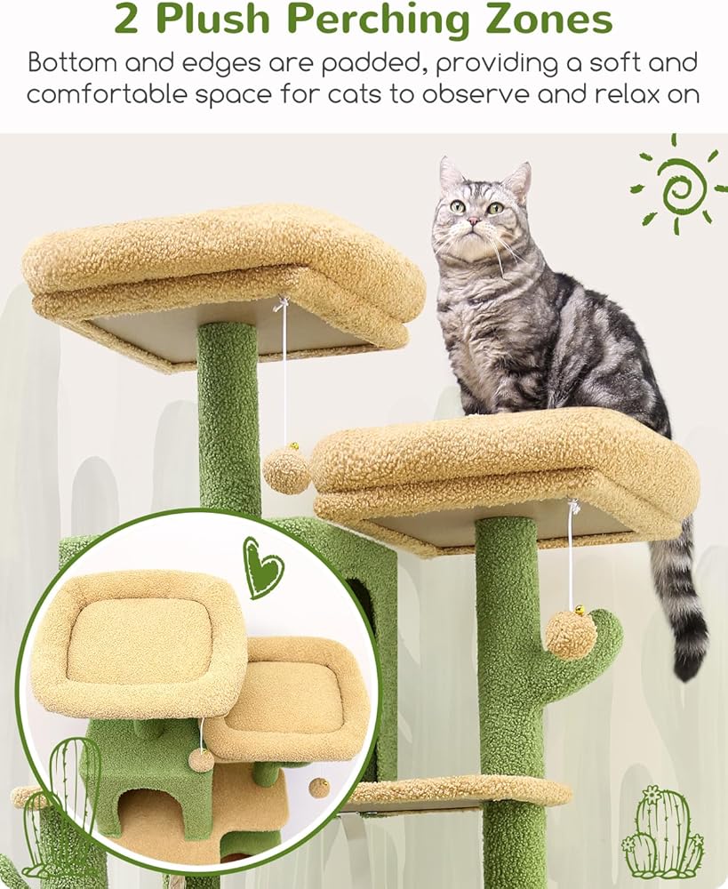 طويلة وواسعة: يبلغ طول شجرة الصبار هذه 61 بوصة، وتتميز بمنصتين علويتين وكهفين مريحين للقطط، مما يوفر لأصدقائك القطط مساحة وفيرة للتسلق والاستكشاف والاسترخاء.