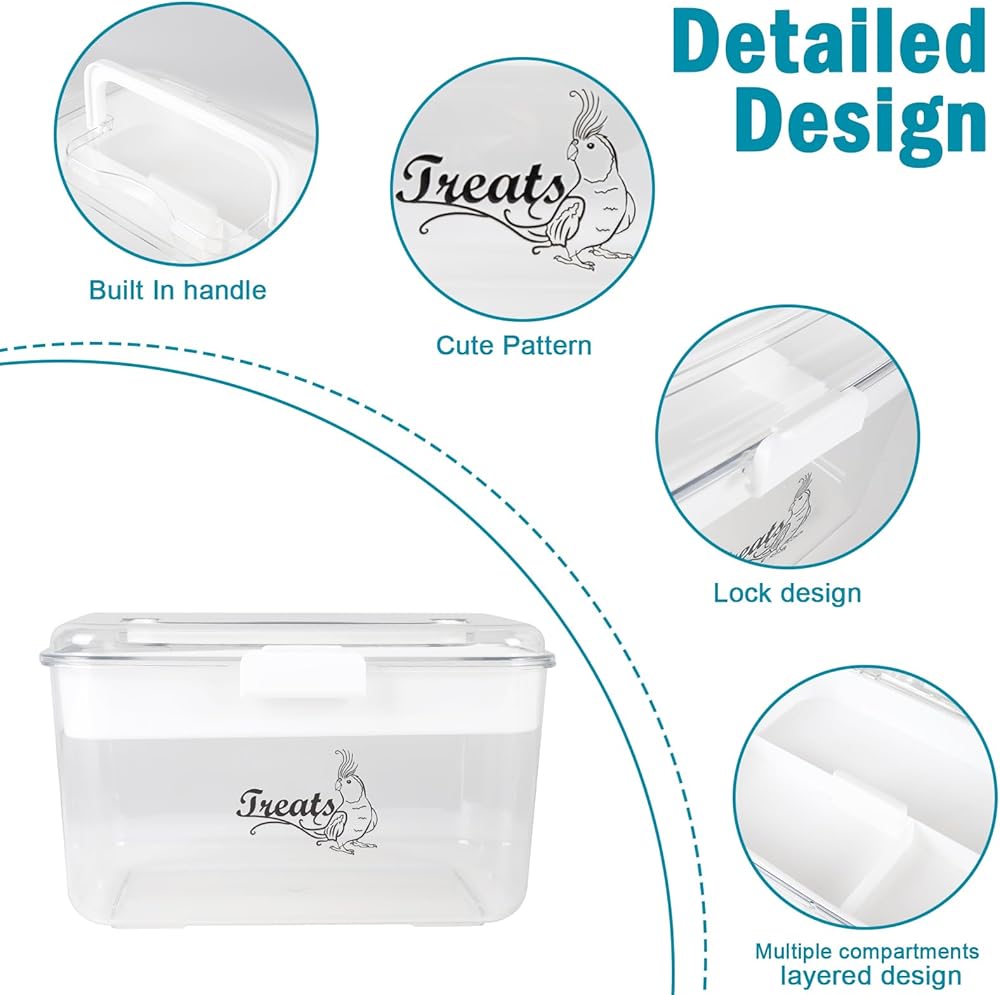 The bird food storage container was designed with 2layer and flip up lid for easy store bird seed and bird treat.