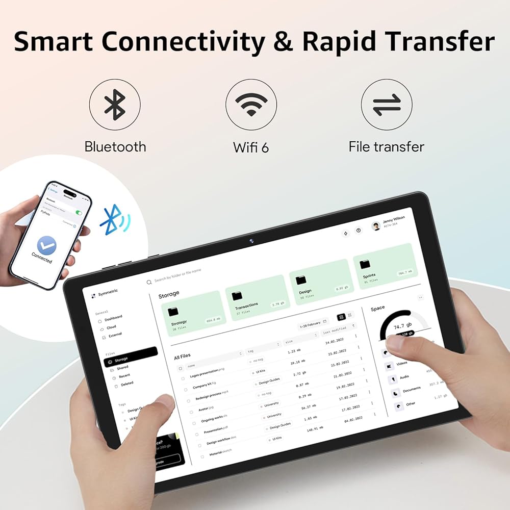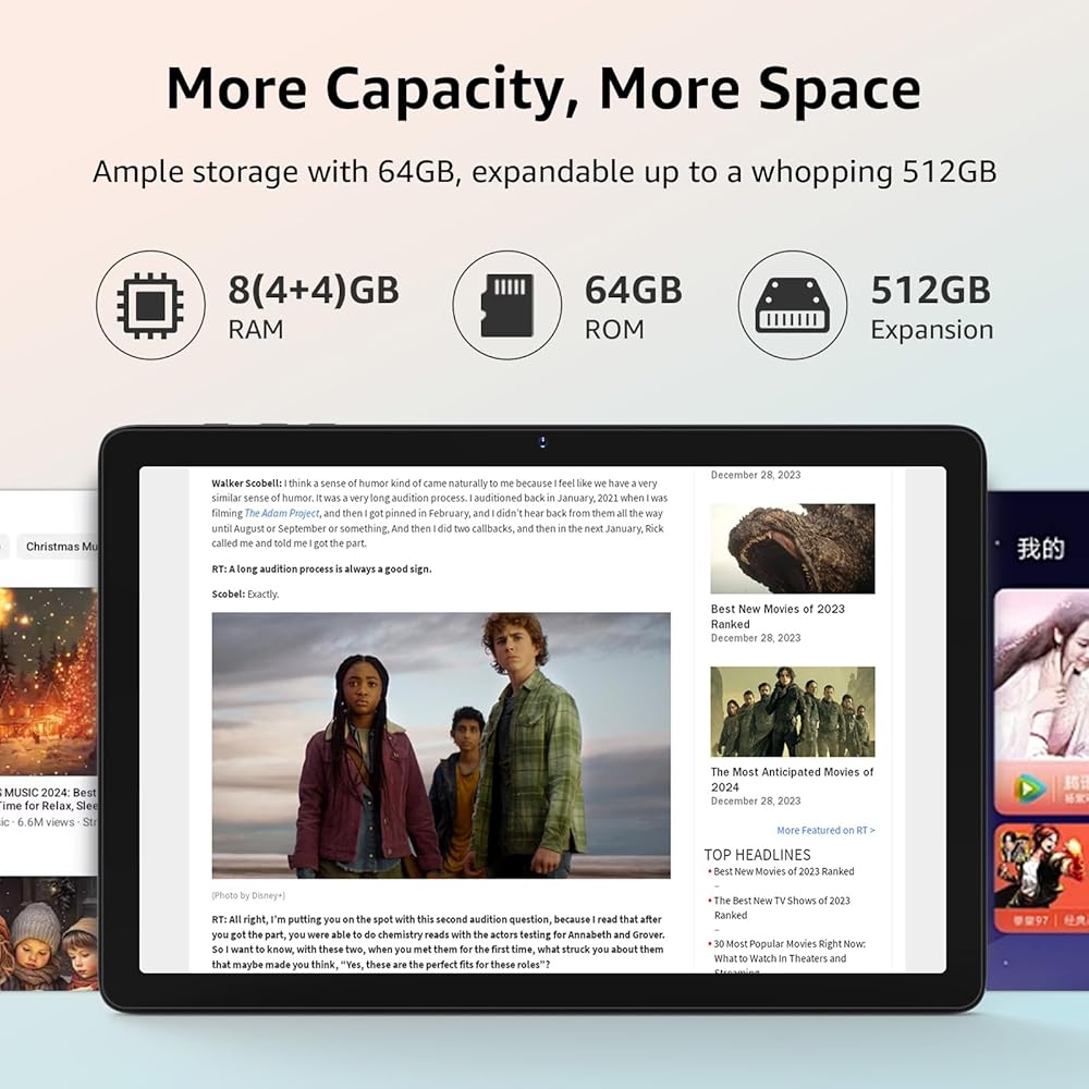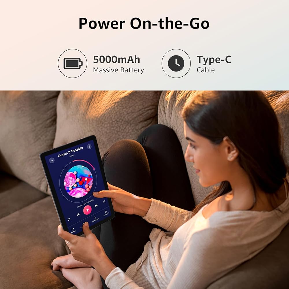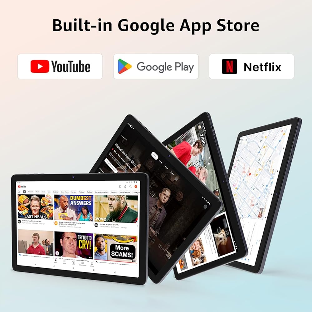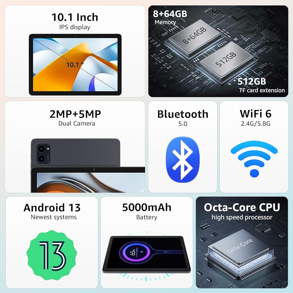 • شاشة IPS مقاس 10.1 بوصة + بطارية طويلة الأمد: استمتع بصور مذهلة على شاشة IPS مقاس 10.1 بوصة بدقة 1280 × 800، مثالية للأفلام والألعاب والقراءة. توفر البطارية بسعة 5000 مللي أمبير في الساعة طاقة طوال اليوم، مما يضمن لك البقاء على اتصال ومستمتعًا أينما ذهبت.