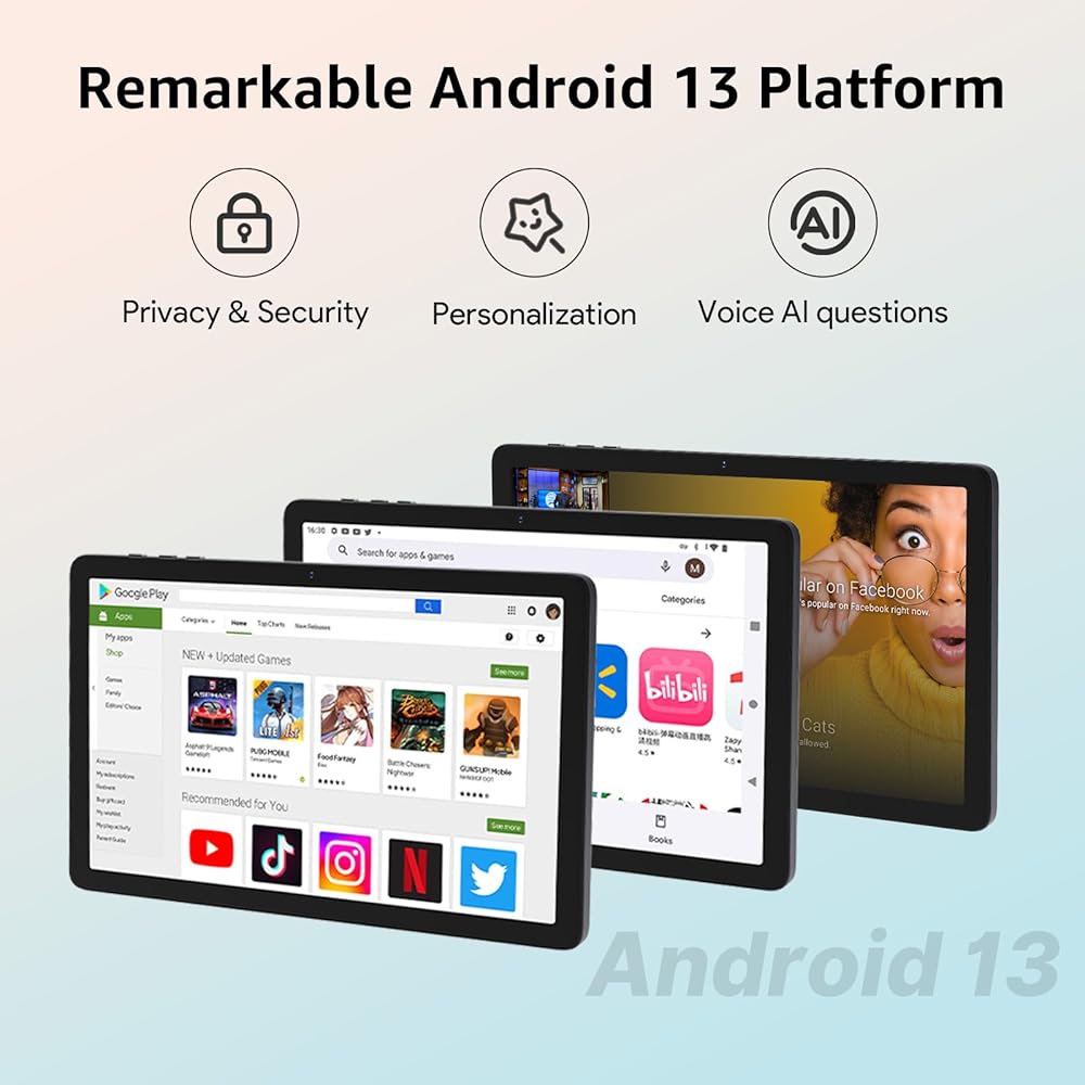 تابلت ApoloSign مقاس 10.1 بوصة يعمل بنظام Android 13 مع معالج ثماني النواة، شاشة LCD تعمل باللمس، محتوى للأطفال، ذاكرة وصول عشوائي 8(4+4) جيجابايت، ذاكرة وصول عشوائي 64 جيجابايت، تخزين قابل للتوسيع 1 تيرابايت، عمر بطارية طويل، كاميرا مزدوجة، واي فاي 6، رم