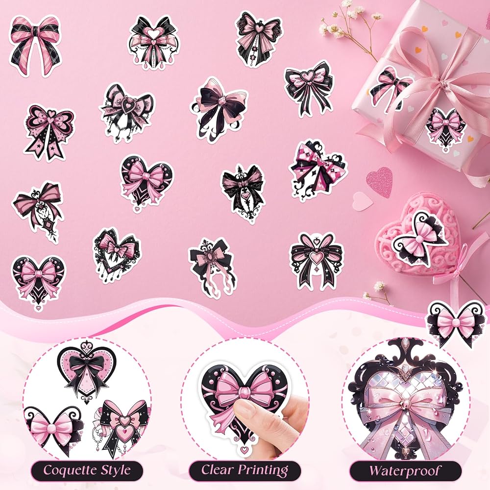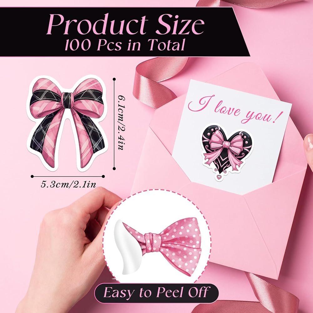 100 قطعة من ملصقات القوس باللونين الأسود والوردي، ملصقات على شكل فيونكة لطيفة باللونين الوردي والأسود، ملصقات جمالية لديكور حفلات أعياد الميلاد باللون الأسود والوردي، مناسبة لإمداد زجاجات المياه بديكور القصاصات، للنساء