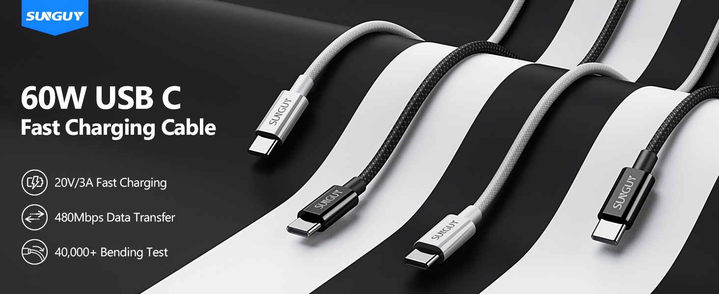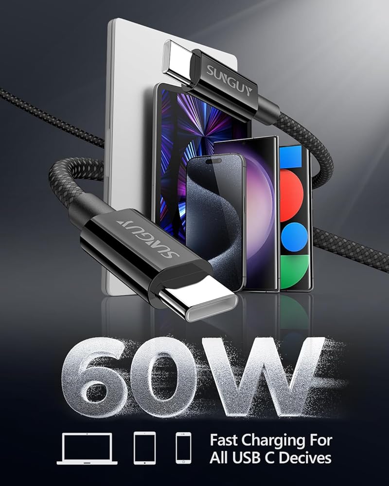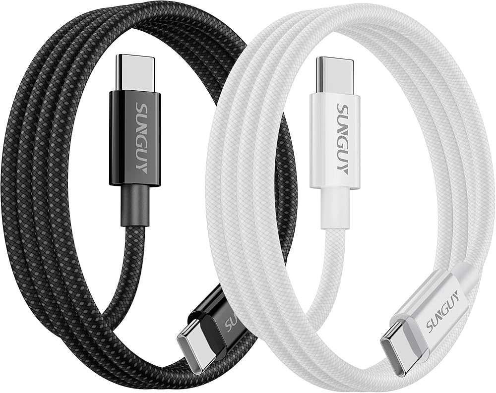 كابل SUNGUY 60 وات USB C إلى USB C بطول 3.3 أقدام، [عبوة من قطعتين] كابل شحن سريع USBC إلى USBC مجدول 3.1 أمبير، متوافق مع iPhone 15/15 Pro/15 Pro Max وGalaxy S24/S23/S22 وMacBook - أسود + أبيض