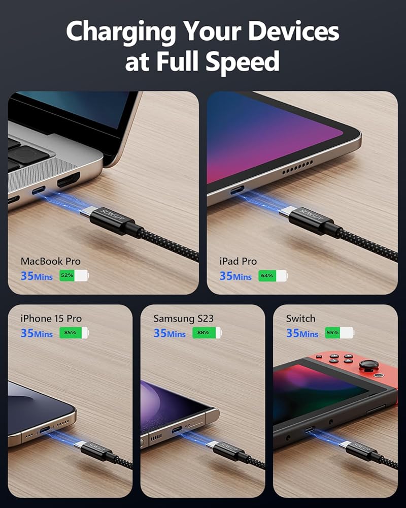 • شحن سريع 60 واط: يدعم كابل usb-c إلى usb-c سرعة شحن تصل إلى 60 واط، مما يعمل على تشغيل الأجهزة بسرعة، قل وداعًا لأوقات الانتظار الطويلة لشحن جهازك.