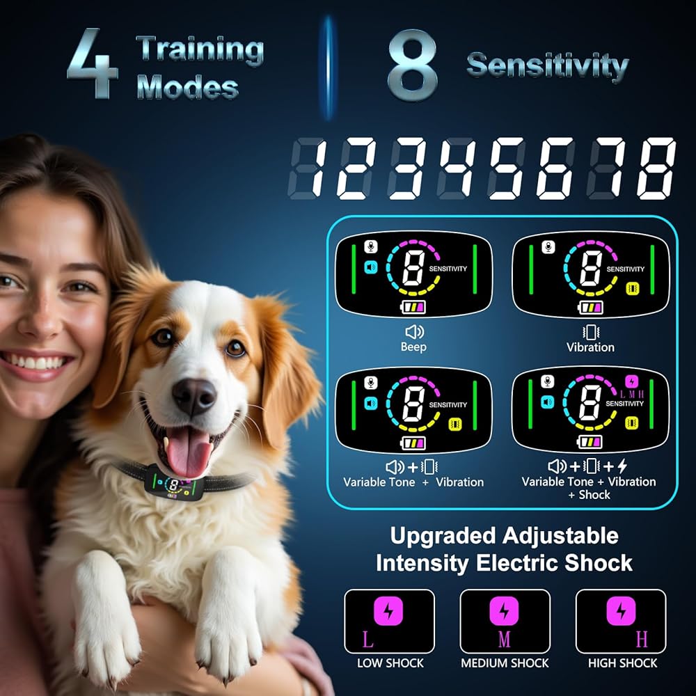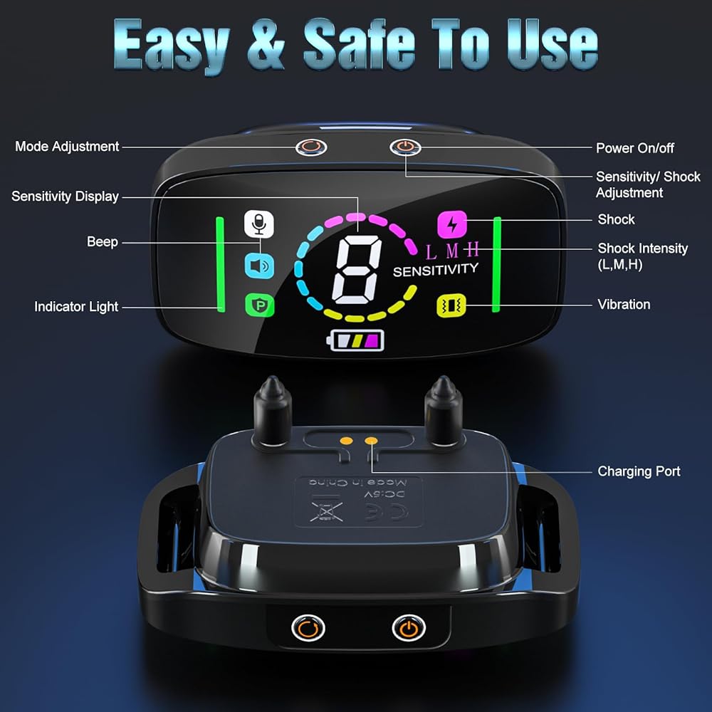 【شحن USB سريع وشاشة LED ملونة كبيرة】شحن مغناطيسي سريع، يتم شحن طوق لحاء الكلب خلال ساعتين ويمكن أن يستمر لمدة تصل إلى 10-15 يومًا. يستخدم طوق نباح الكلاب هذا واجهة ألوان LED واسعة النطاق بديهية مع محتوى عرض أكثر ثراءً وإحساسًا قويًا بالتكنولوجيا. تعرض الشاشة الملونة طاقة البطارية وتذكير انخفاض البطارية، مما يجعلها سهلة الاستخدام