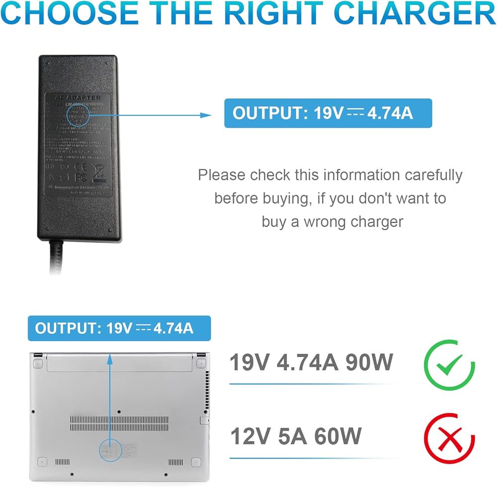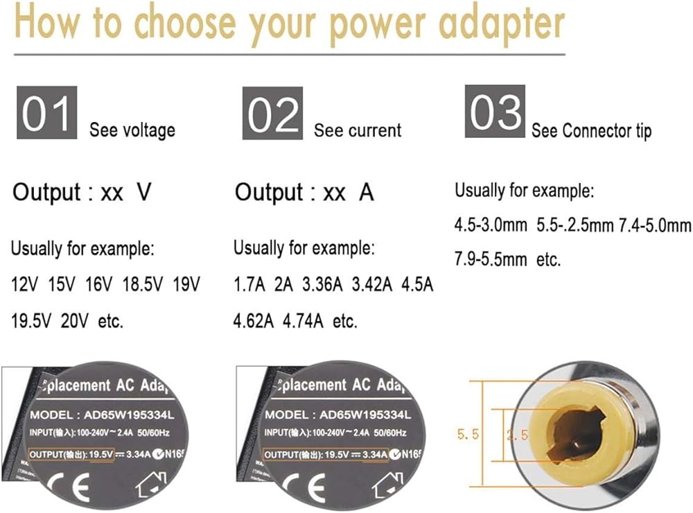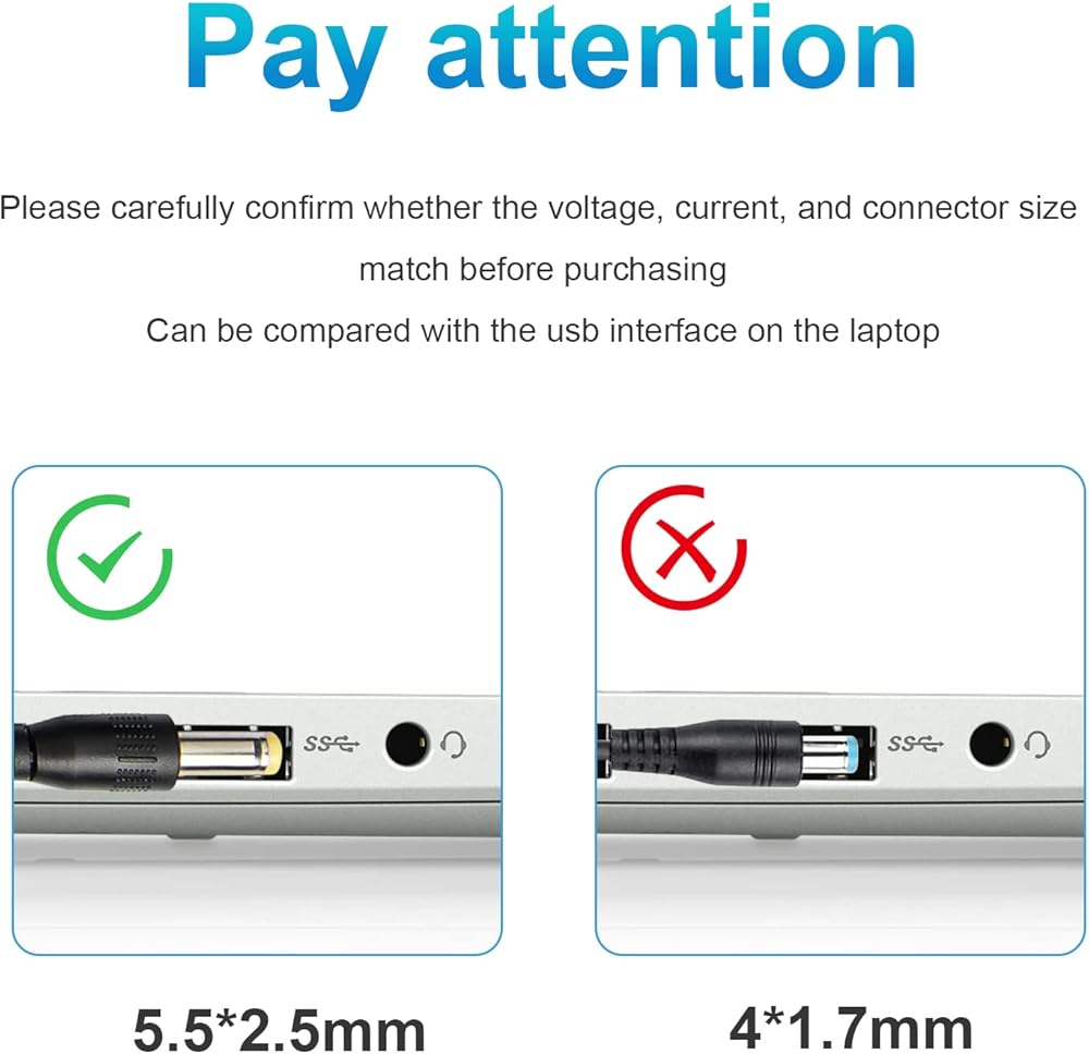 POWER SPECS: Input Volt Range: AC 110-240V / Output: DC 19V 4.74A, 90W also fits 65W, DC CONNECTER SIZE: Internal Diameter: 2.5mm, External Diameter: 5.5mm