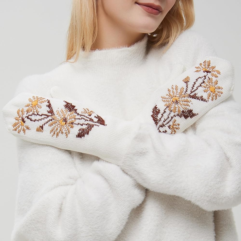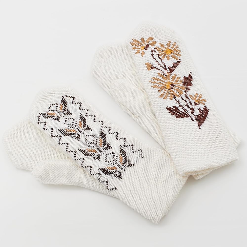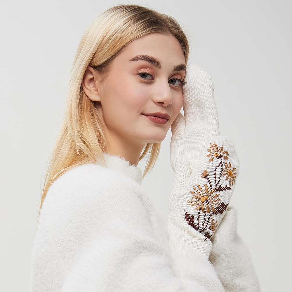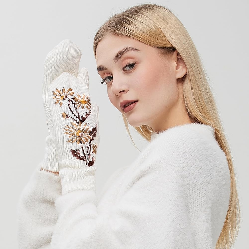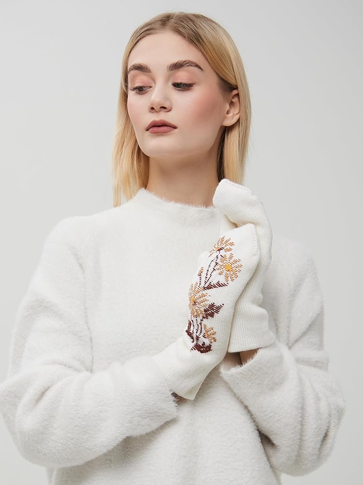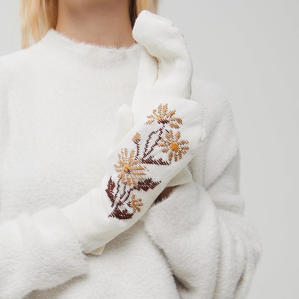 Women's Hand-Embroidered Mittens, White Knitted Gloves for Women, Floral Design Cute Mittens.