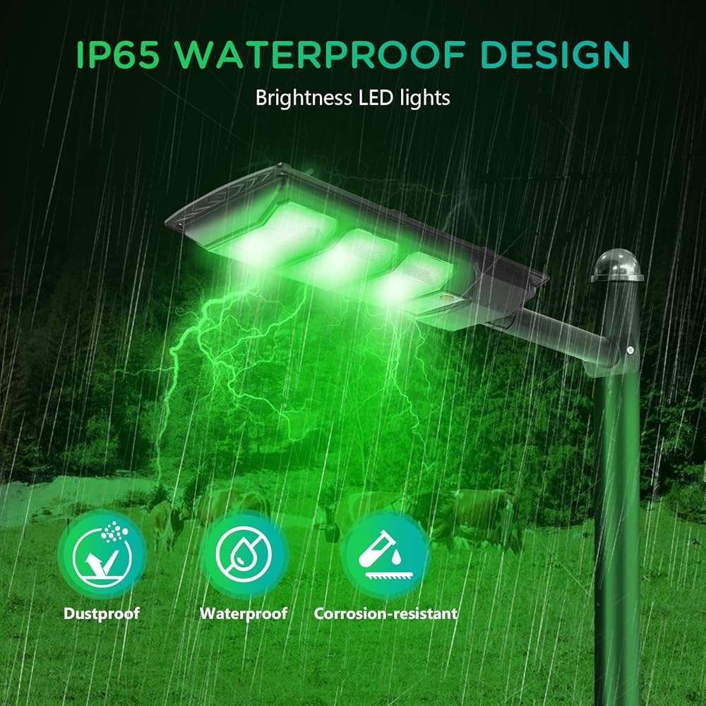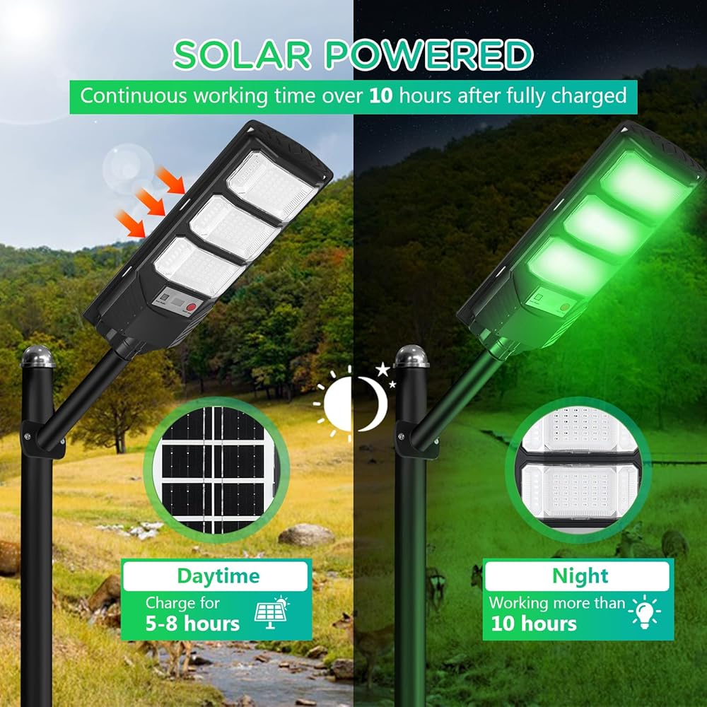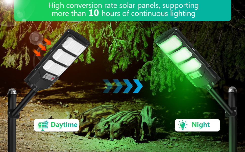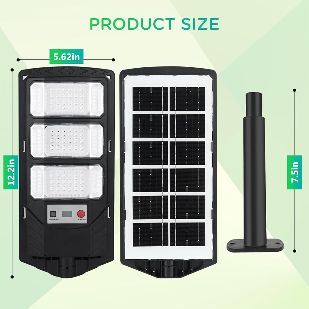 الطاقة الشمسية: ينتج هذا الجهاز 9000 لومن، مدعومًا بألواح شمسية عالية الكفاءة لتقليل تكاليف استبدال البطارية. يوفر أكثر من 10 ساعات من التشغيل المستمر عند الشحن الكامل ويتميز بوظيفة التشغيل/الإيقاف التلقائي بناءً على الإضاءة المحيطة
