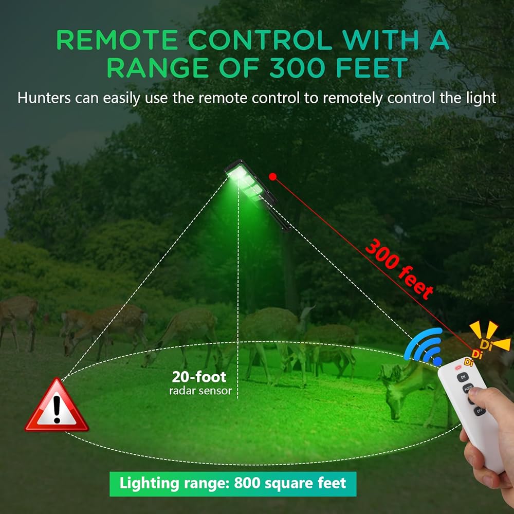 استشعار رادار ذكي وجهاز تحكم عن بعد: مزود بوظيفة استشعار رادار بطول 20 قدمًا، فهو يكتشف نشاط الحيوان تلقائيًا ويضيء الضوء. مع جهاز تحكم عن بعد لاسلكي بمدى يصل إلى 300 قدم، يمكنك بسهولة التحكم في الضوء عن بعد عندما يصدر صوت التنبيه "صفير"، مما يحسن راحة الصيد.