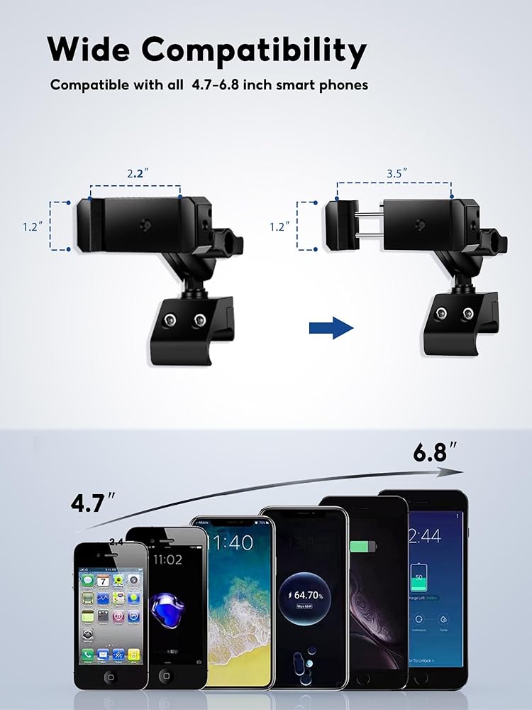 🏕🚘 متوافق على نطاق أوسع: يتوافق حامل الهاتف لسيارة الجيب مع جميع الهواتف مقاس 4.7-6.8 بوصة. يمكن أن يعمل زنبرك قابل للسحب على توسيع مساحة أكبر لمزيد من أنواع الهواتف المحمولة.