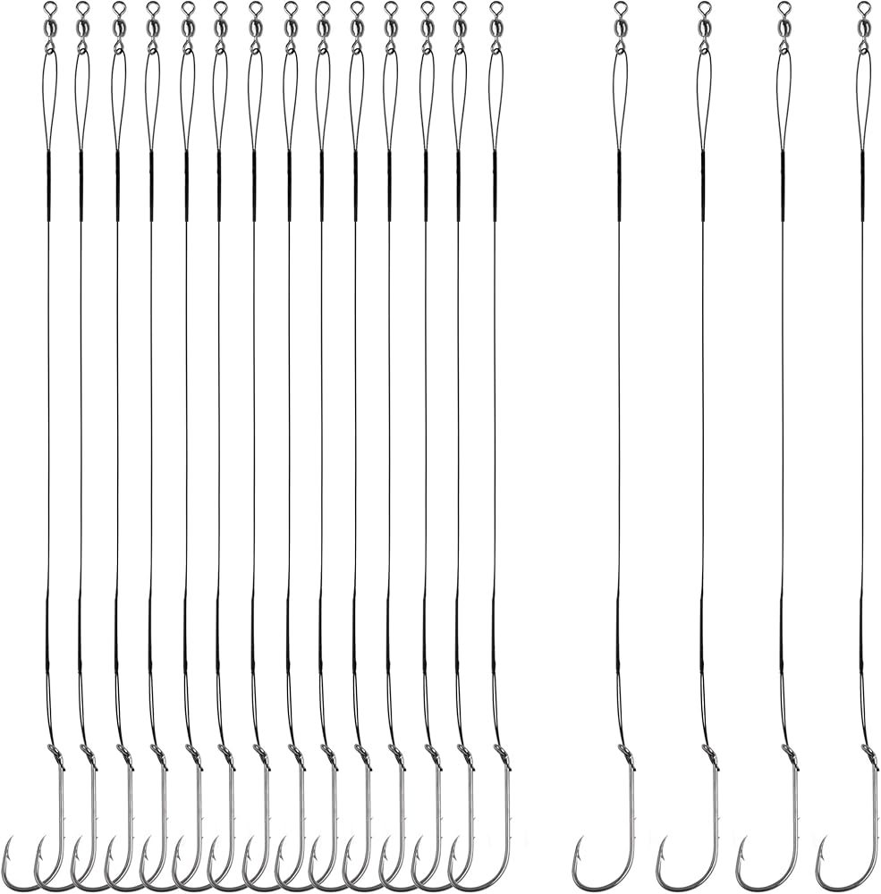 【Size & Quantity】Comes with 18pcs fishing hooks rigs.There are 4 sizes fishing hooks,including 1/0 2/0 1# 2#,Length :11.8 in, main leader tested is about 90 lbs.
