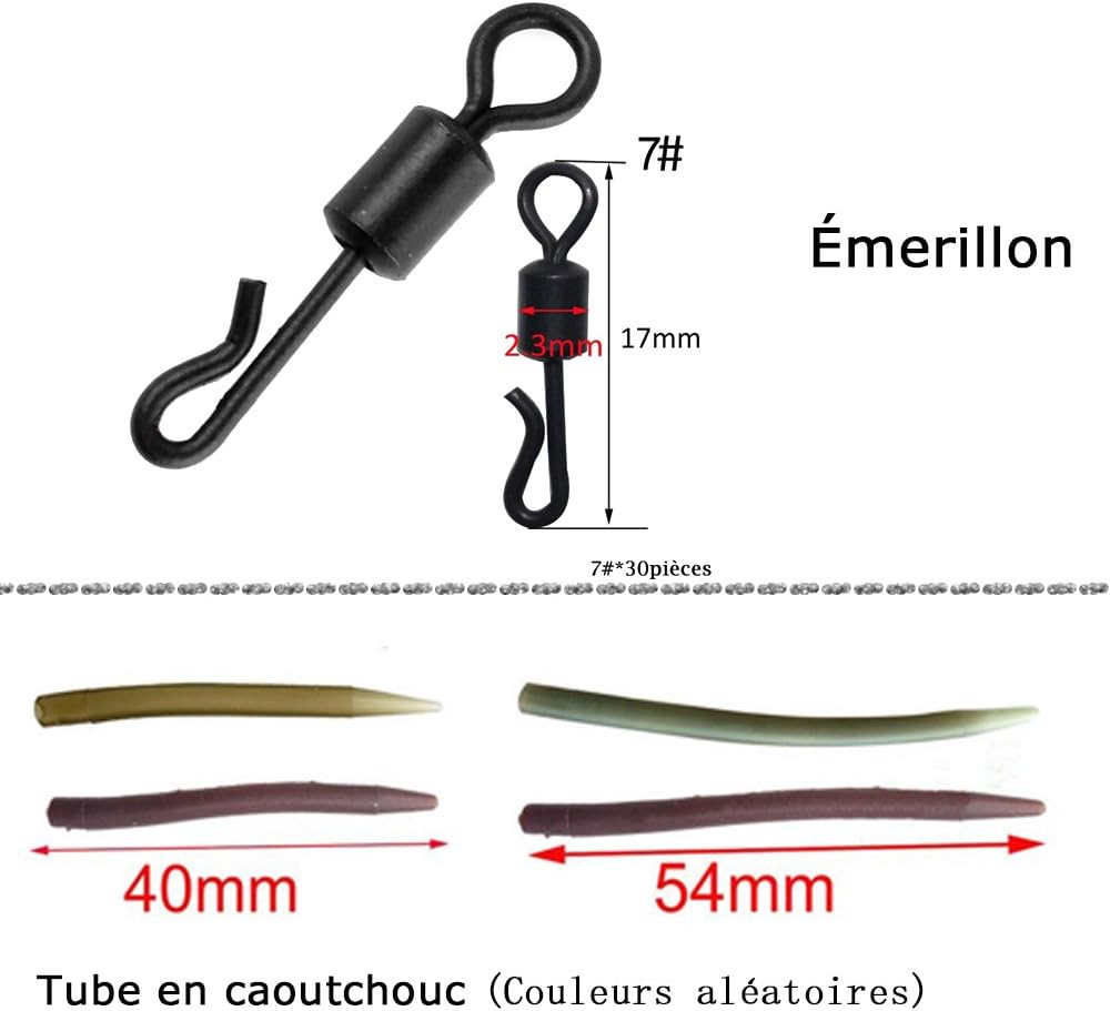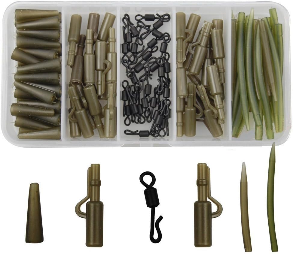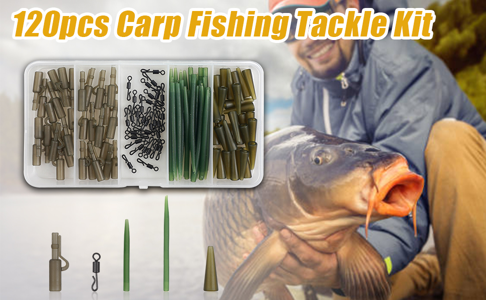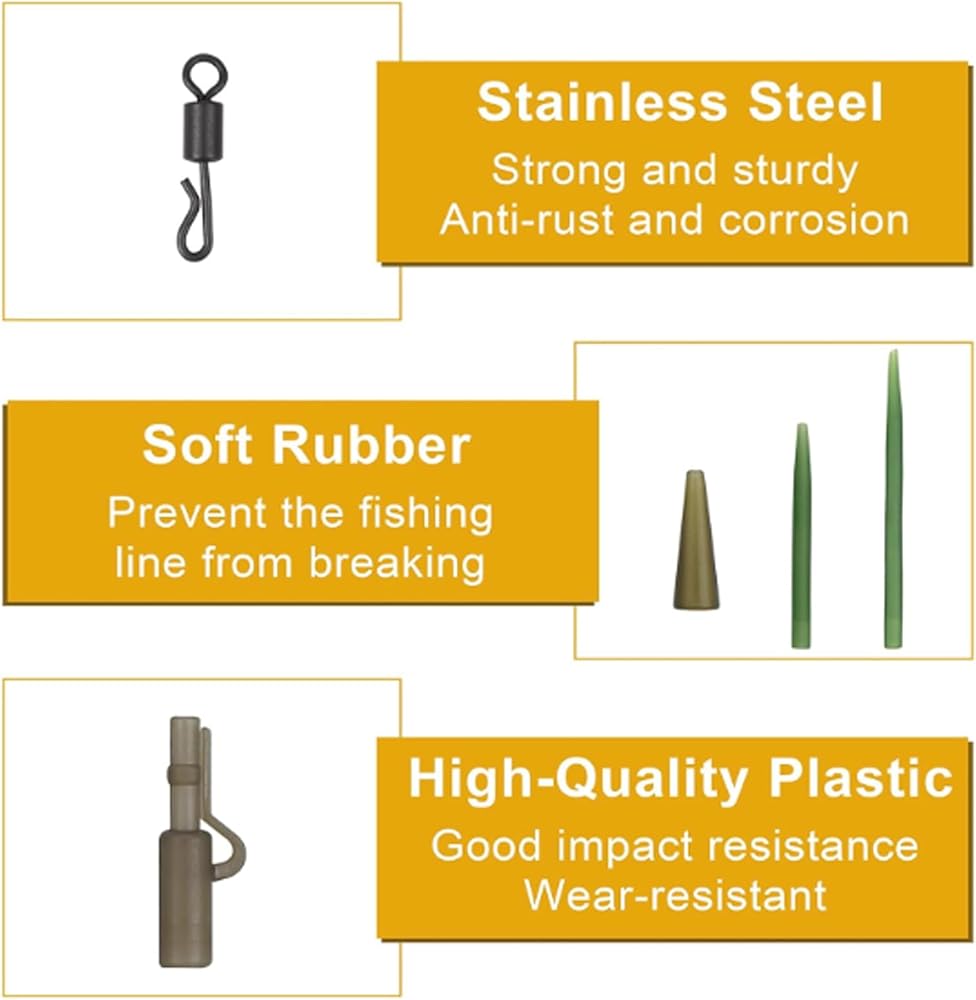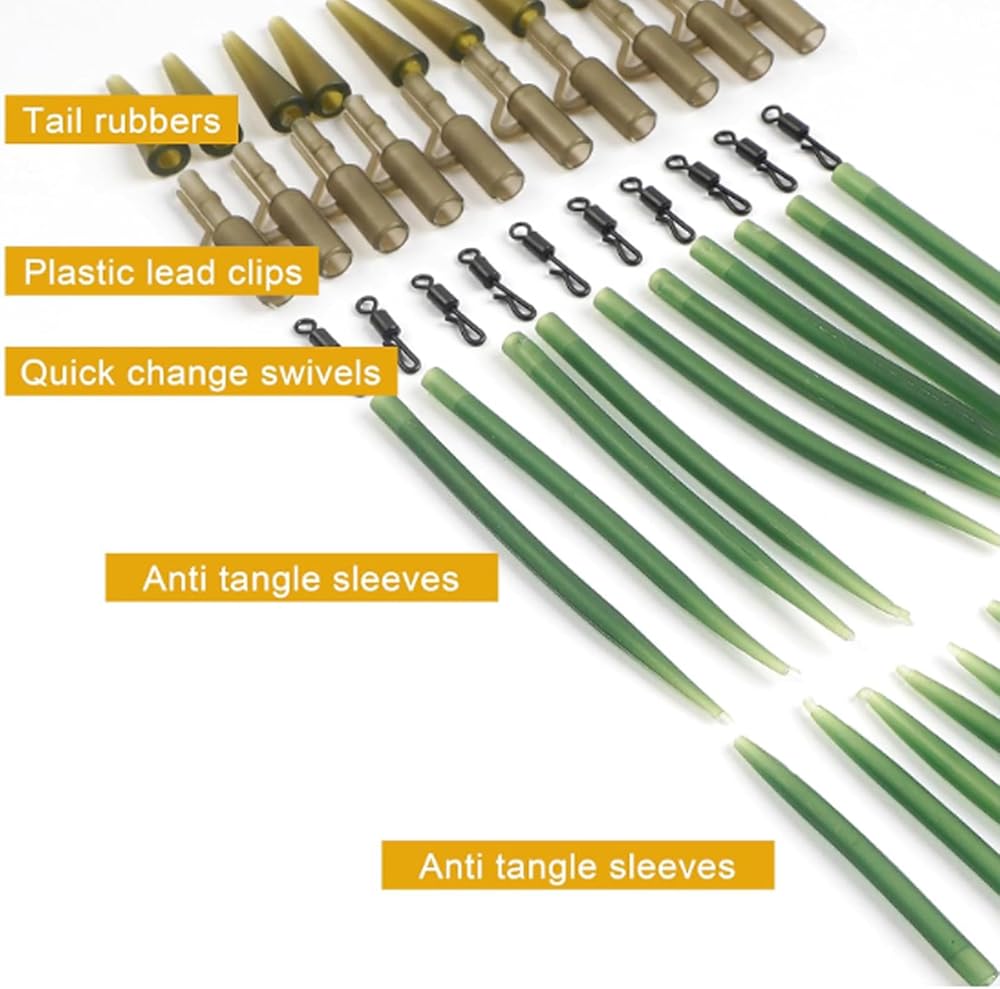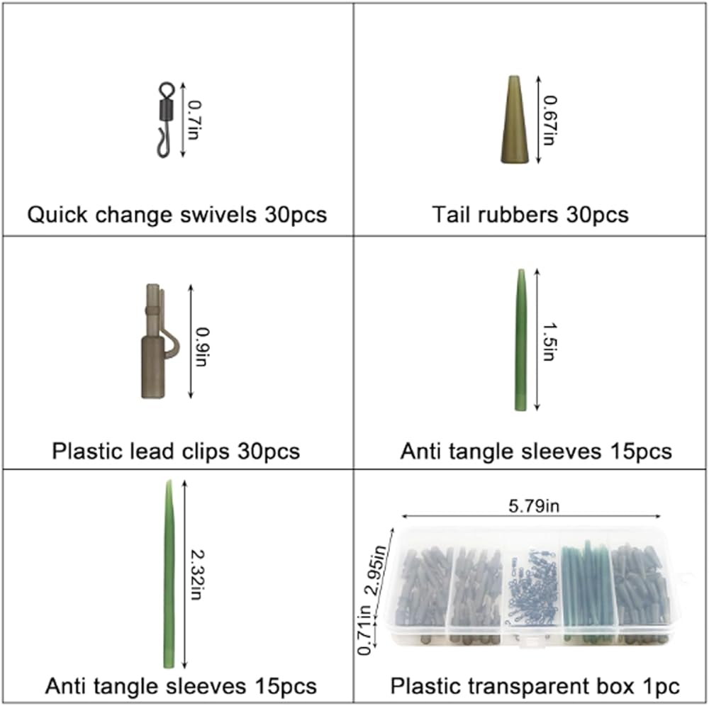 120 قطعة من أدوات صيد سمك الشبوط - تتضمن العبوة 30 قطعة من مشابك قائد سلامة سمك الشبوط، و30 قطعة من مخاريط ذيل مشبك قائد السلامة، و30 قطعة دوارة سوداء سريعة التغيير، و30 قطعة أكمام مضادة للتشابك.