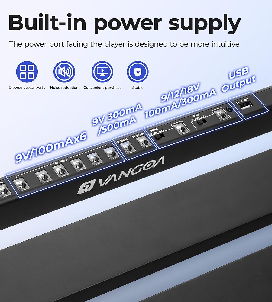 [مجموعة الكل في واحد وطاقة سهلة] تأتي لوحة دواسات الجيتار Vangoa مع مصدر طاقة مدمج وتحتوي على منافذ إخراج 9 فولت/12 فولت/18 فولت، ويمكنها تشغيل 10 دواسات في نفس الوقت؛ يواجه منفذ الطاقة المشغل، مما يجعل التشغيل أكثر سهولة وملاءمة، وسيمنعك من ركل الأسلاك عن طريق الخطأ. (ملاحظة: توجد لوحة دائرة في واجهة الطاقة، يرجى عدم الوقوف عليها)