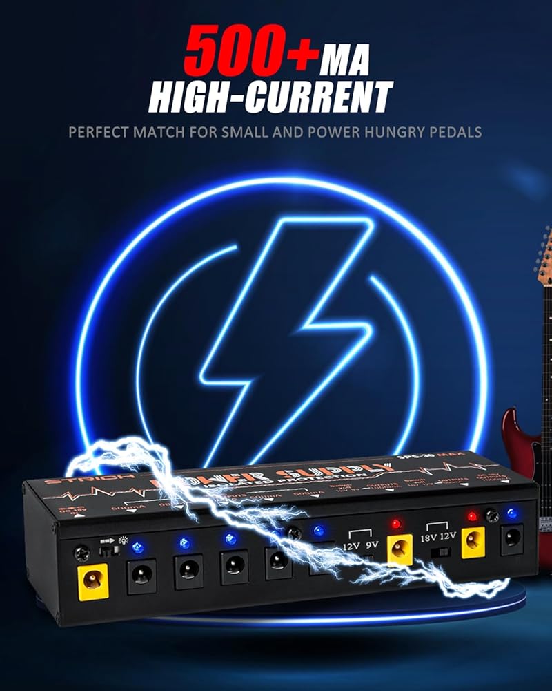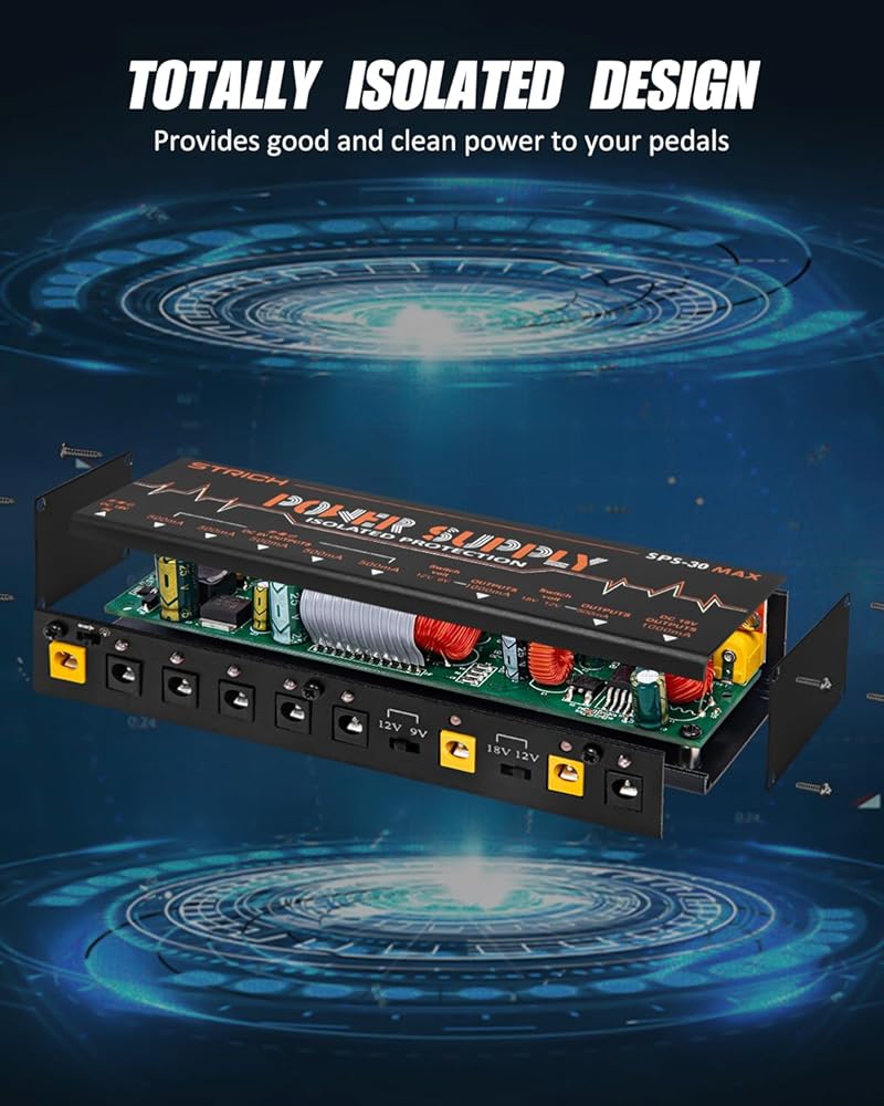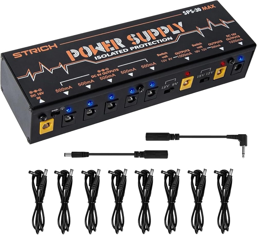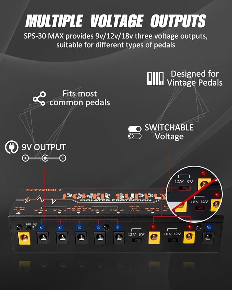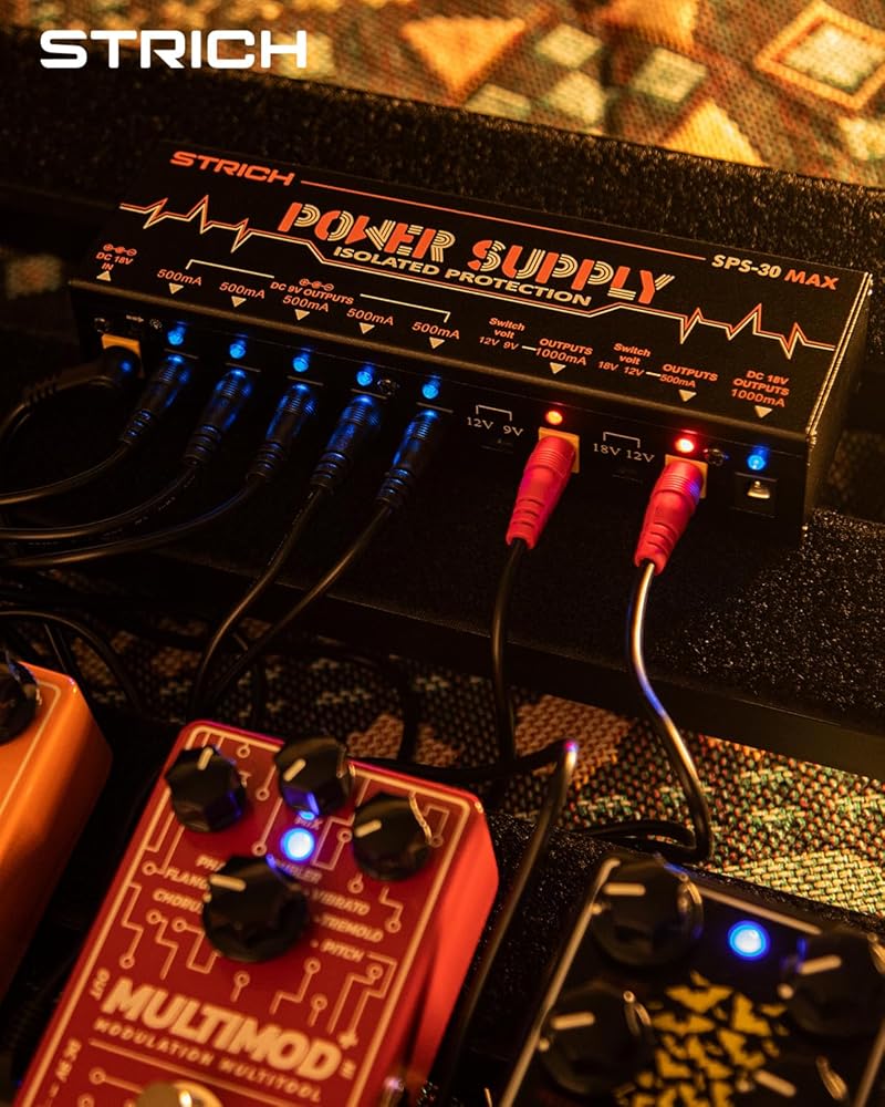 STRICH SPS-30 MAX مزود طاقة عالي لدواسة الجيتار، مزود طاقة للوحة الدواسات مع 8 مخارج تيار مستمر معزولة تمامًا 9 فولت/12 فولت/18 فولت (500 مللي أمبير/1000 مللي أمبير)، مزود طاقة لدواسة التأثير المتعطشة للطاقة، بدون ضوضاء