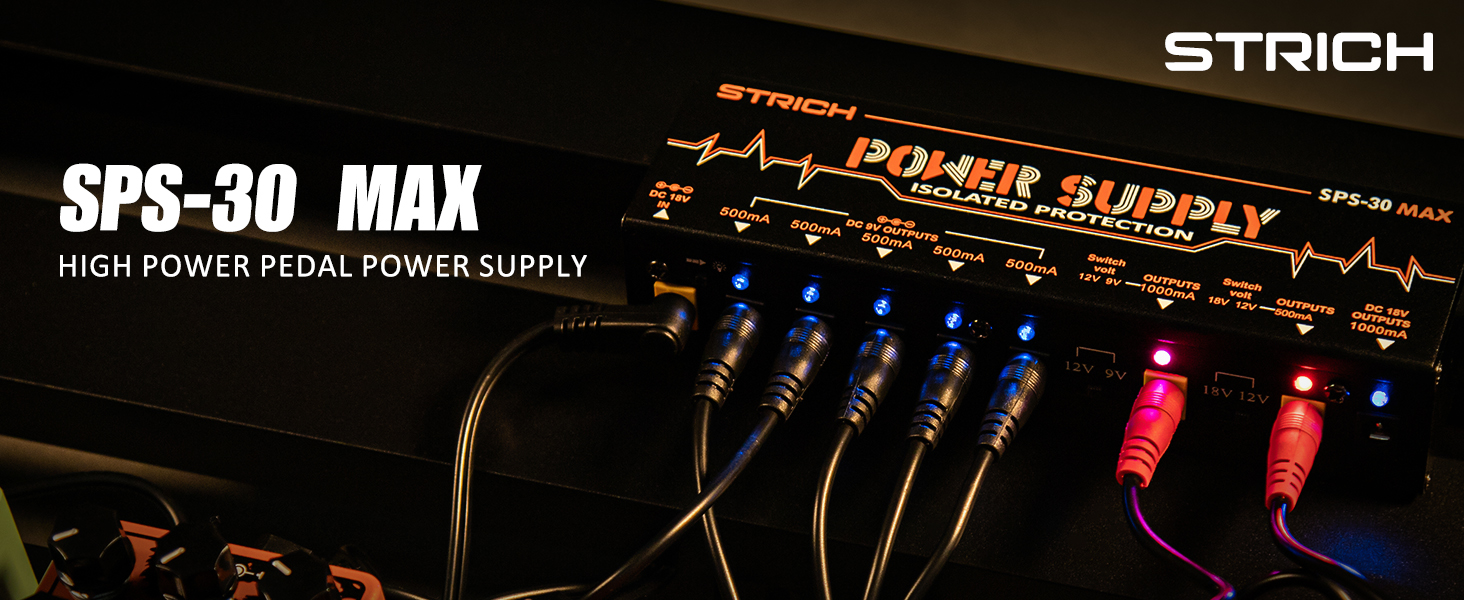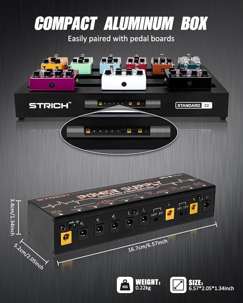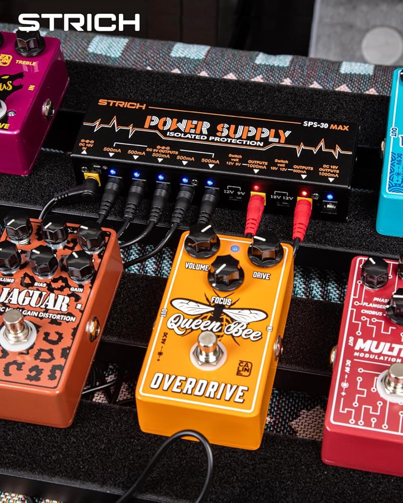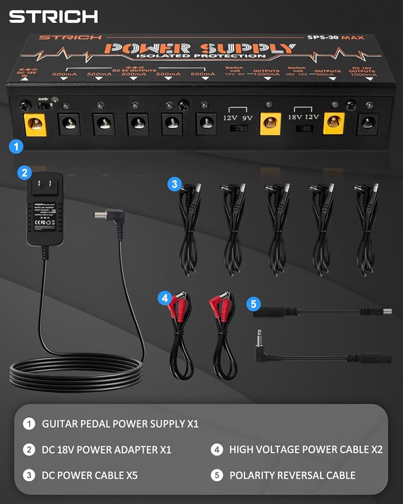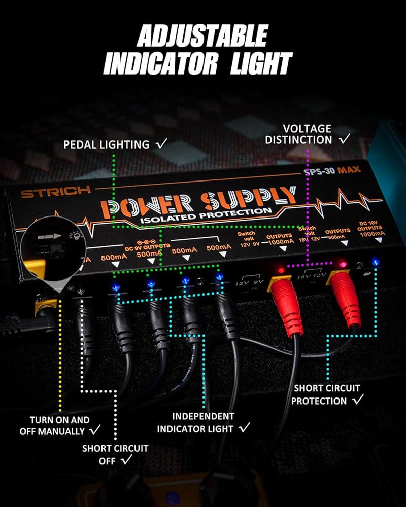 STRICH SPS-30 MAX مزود طاقة عالي لدواسة الجيتار، مزود طاقة للوحة الدواسات مع 8 مخارج تيار مستمر معزولة تمامًا 9 فولت/12 فولت/18 فولت (500 مللي أمبير/1000 مللي أمبير)، مزود طاقة لدواسة التأثير المتعطشة للطاقة، بدون ضوضاء