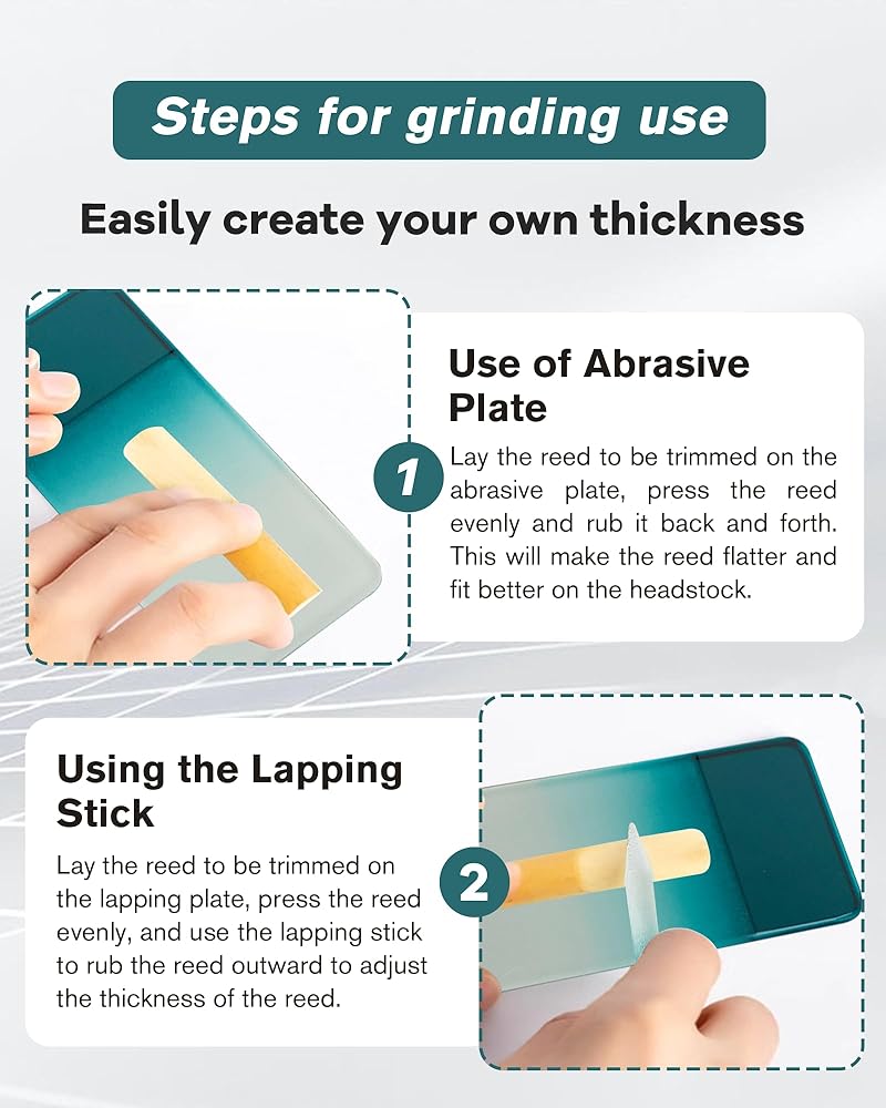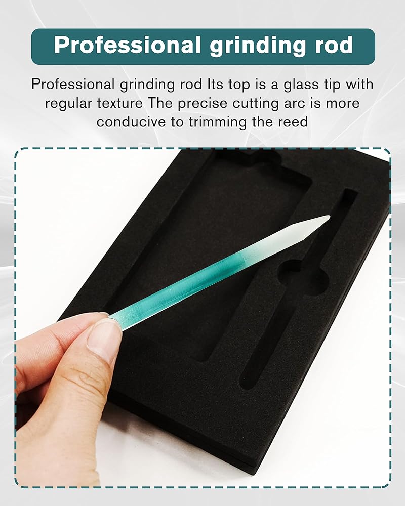 • ♬ Precision Abrasive Rod: Our professional abrasive rod lays the reed to be trimmed on the lapping plate, press the reed evenly, and use the lapping stick to rub the reed outward to adjust the thickness of the reed. This unique design ensures that each cut is clean and uniform, resulting in improved playability and tone.