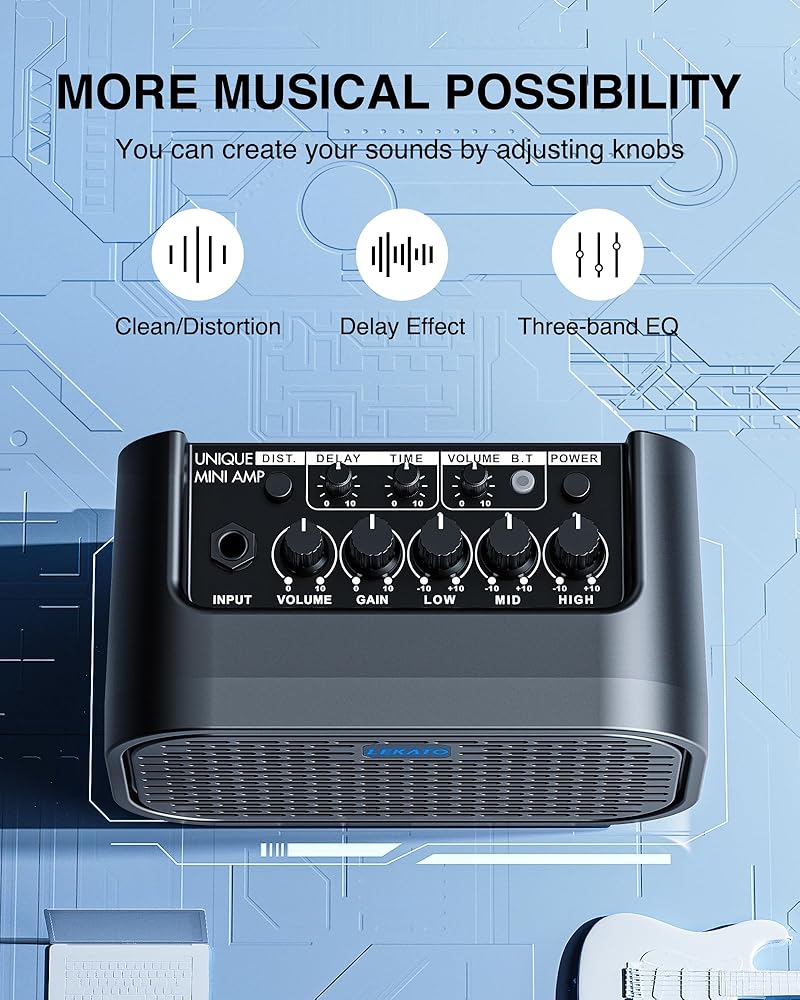 🎸[قناتان] يحتوي مضخم الجيتار هذا على نغمتين، التنظيف والتشويه، ويمكن تبديلهما بزر واحد. له تأثيرات تأخير، ومعادل صوت ثلاثي النطاق (مرتفع - متوسط - منخفض)، وتنظيم الكسب