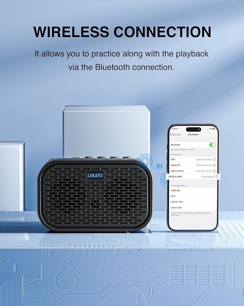 🎸[وظيفة صوت B.T] يدعم مضخم صوت الجيتار الكهربائي LEKATO وظيفة الصوت B.T (5.0)، ومن السهل إقرانه بهاتفك، ويسمح لك بالتشغيل مع الموسيقى