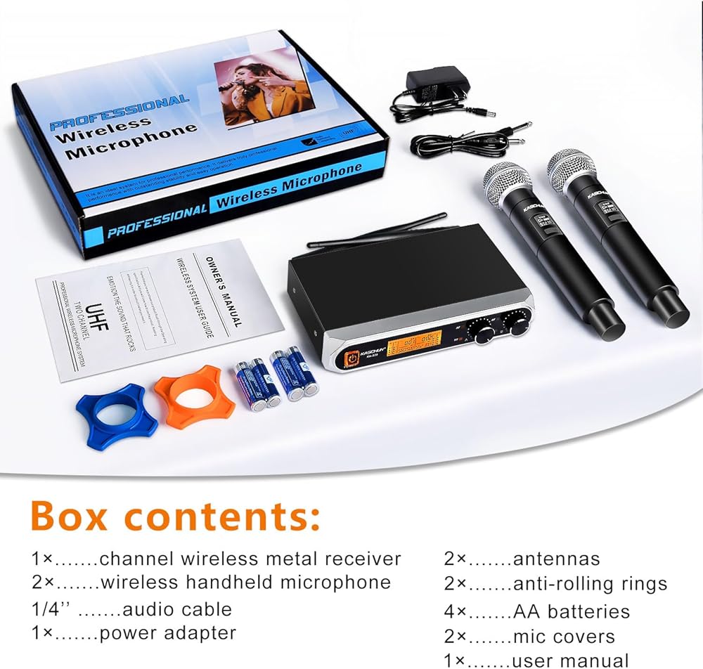 ⭐️ما تحصل عليه: 2 * ميكروفون محمول، 1 * جهاز استقبال، 1 * كابل صوت 6.35 ملم، 2 * حلقة مضادة للانزلاق، 2 * أغطية ميكروفون، 2 * بطاريات AA، 1 * دليل. يوفر هذا المنتج المجاني 12 شهرًا من الاستخدام -خدمة المبيعات. إذا كانت هناك أي مشاكل مع المنتج الخاص بك، فيرجى الاتصال بنا. سوف نقوم باستبدال منتجك بمنتج جديد.