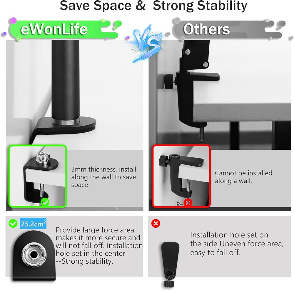 قاعدة معدنية: قم بزيادة المنطقة الثابتة مع سطح المكتب، وتعزيز ثبات الدعامة، وجعل القوة أكثر تساويًا. الحد الأقصى لمسافة التثبيت هي 60 مم، وتصل إلى 2.36 بوصة والتي يمكنها تثبيت أجهزة الكمبيوتر المكتبية الأكثر سمكًا