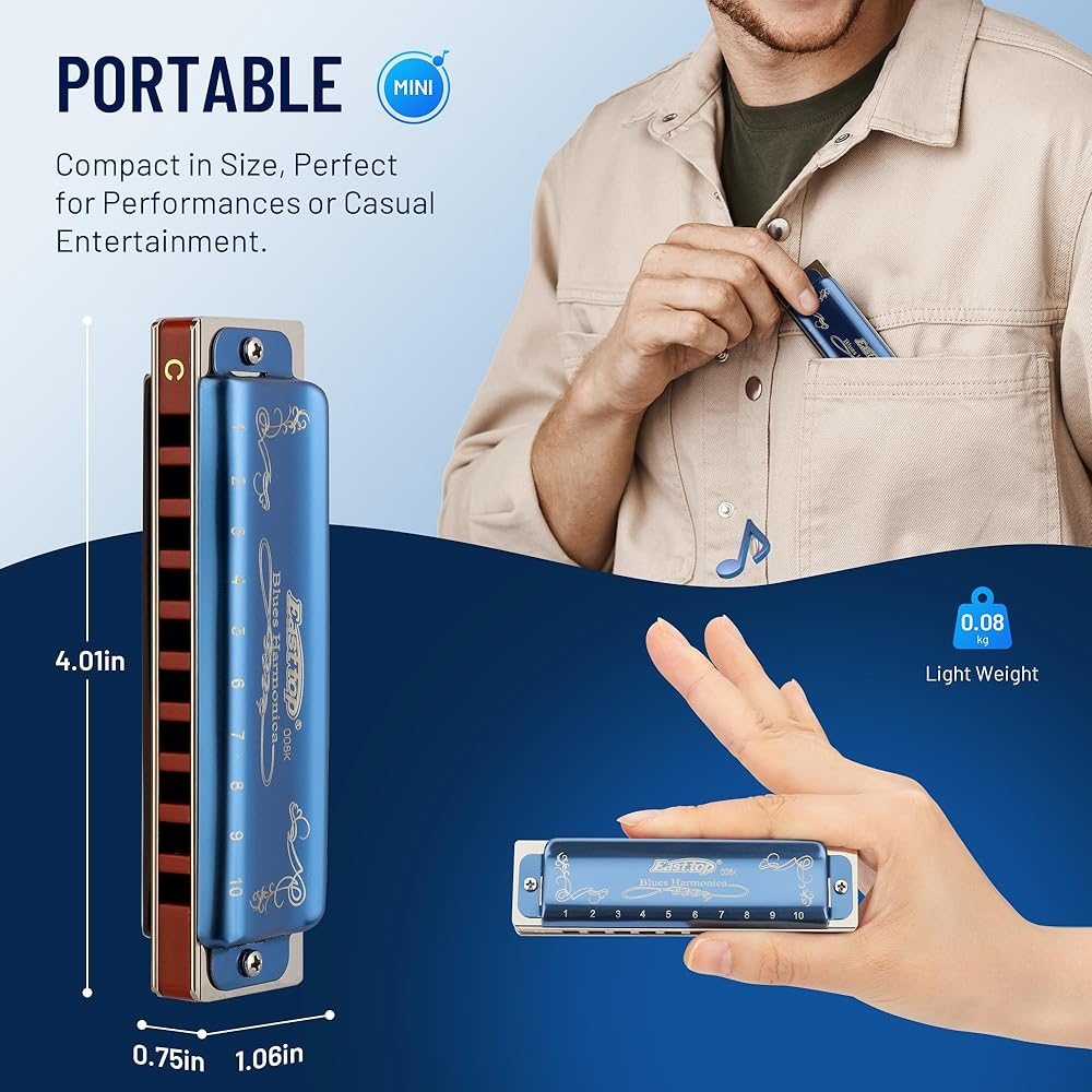 حجم الجيب وسهل الحمل - (4.01 × 1.06 × 0.75) بوصة/ (102 × 27 × 19) مم (الطول × العرض × الارتفاع)، يمكنك وضع هارمونيكا واحدة في جيبك، ويمكن تشغيلها في كل مكان، مثل الحفلات، المدرسة والمكتب والرحلة الخ.