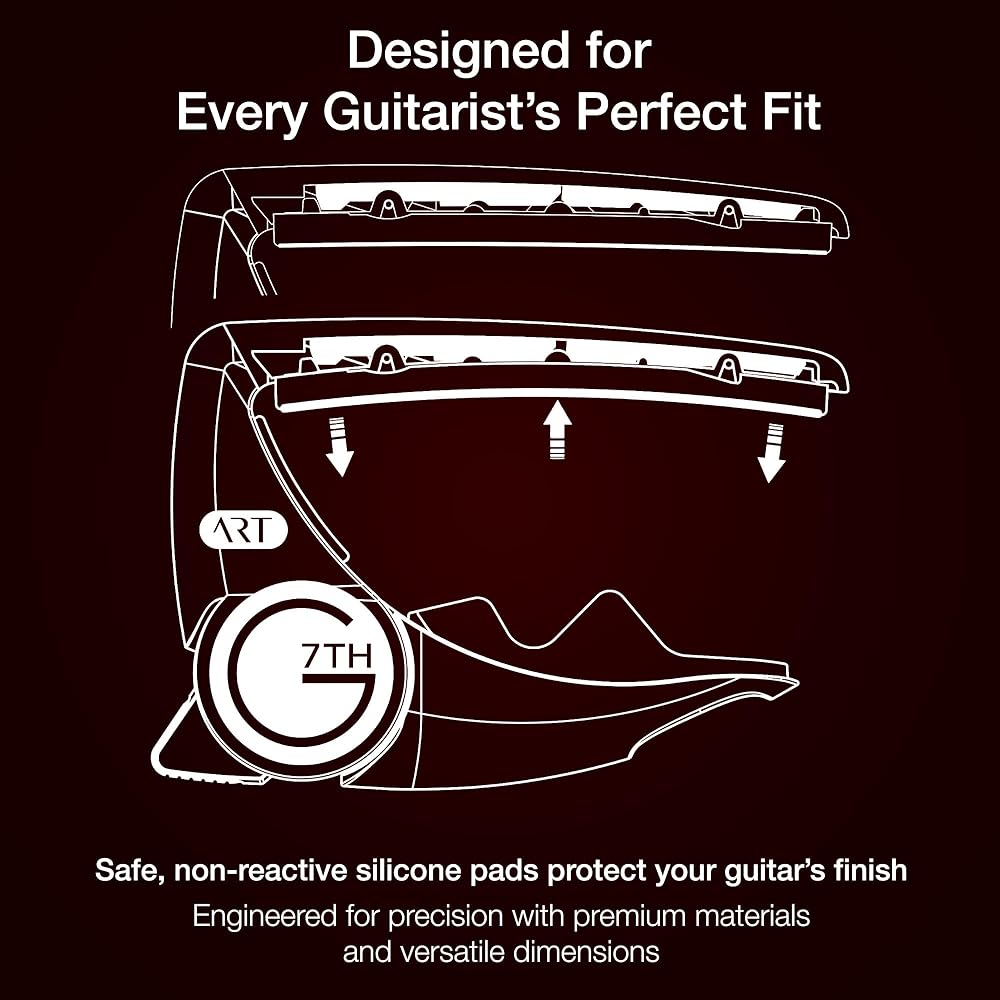 • ART system within the top bar of the Performance 3 capos mechanically adapts to the true curvature over your strings and fretboard, exerting completely even pressure across all the strings