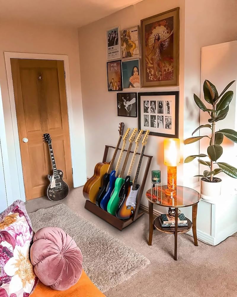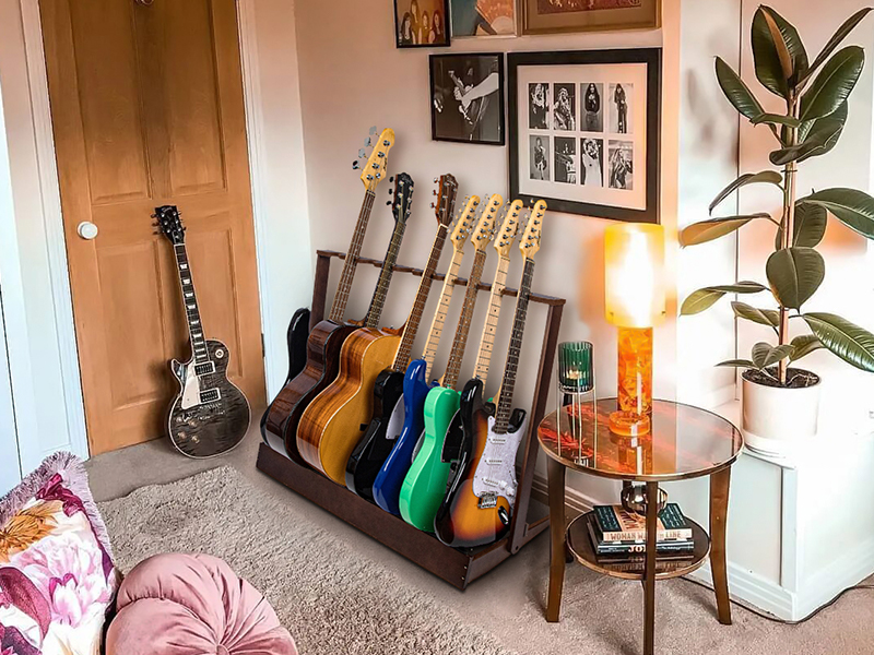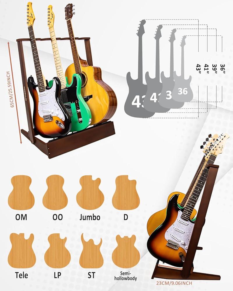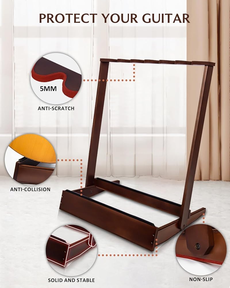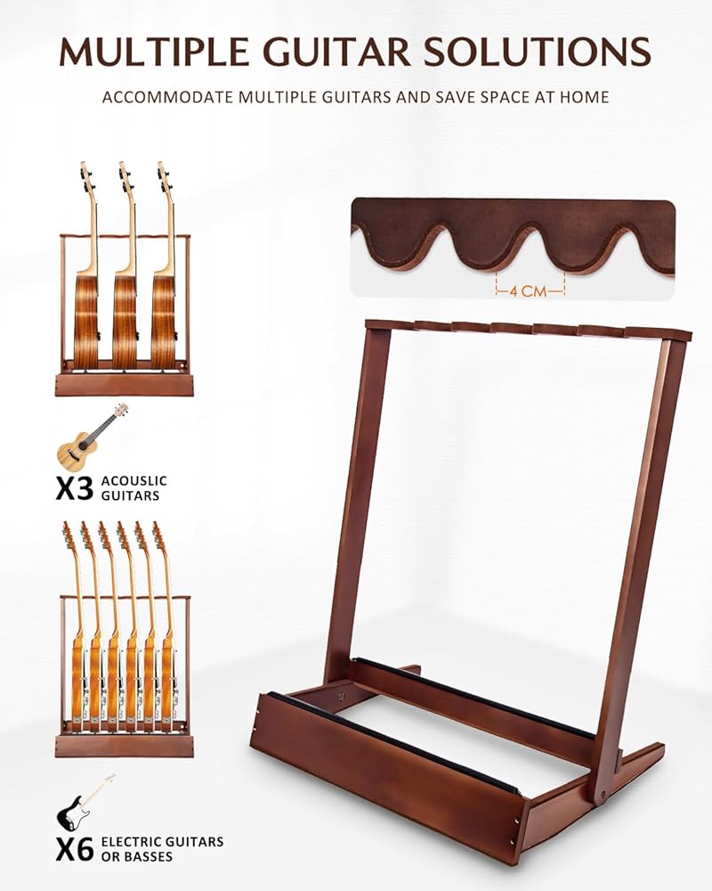 تصميم لجيتار متعددة - يمكن لرف الجيتار الأرضي استيعاب ما يصل إلى 6 جيتار كهربائي أو باس في نفس الوقت (أو 3 جيتار كلاسيكي صوتي). تم إعادة تصميم ارتفاع الحامل والعرض السفلي ليناسب المزيد من أنواع الأدوات التي يزيد حجمها عن 36 بوصة (3/4)، مثل st، lp، dreadnought، parlor، bass،banjos، إلخ.