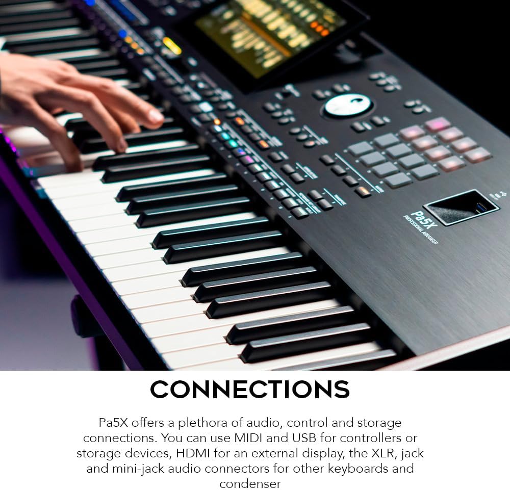• Connections: Pa5X offers a plethora of audio, control and storage connections. You can use MIDI and USB for controllers or storage devices, HDMI for an external display, the XLR, jack and mini-jack audio connectors for other keyboards and condenser
