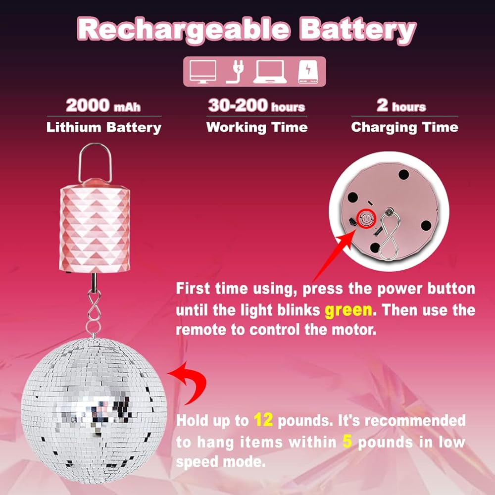 🙆 محرك قابل لإعادة الشحن يوفر أموالك: المحرك الدوار لتعليق ديكور الحديقة منخفض استهلاك الطاقة ولا يصدر ضوضاء. يحتوي محرك كرة الديسكو للتحكم عن بعد على بطارية ليثيوم بوليمر بقدرة 2000 مللي أمبير في الساعة تساوي 8 بطاريات من النوع AA عن طريق توفير ما يصل إلى 100 دولار من تكلفة شراء البطارية سنويًا، مما يستحق كل قرش تنفقه. يمكن تعليق هذا المحرك البطيء باللون الذهبي الوردي في الداخل والخارج لتعليق الديكور المفضل لديك أو كهدية صغيرة للأصدقاء وزملاء الدراسة والأقارب.