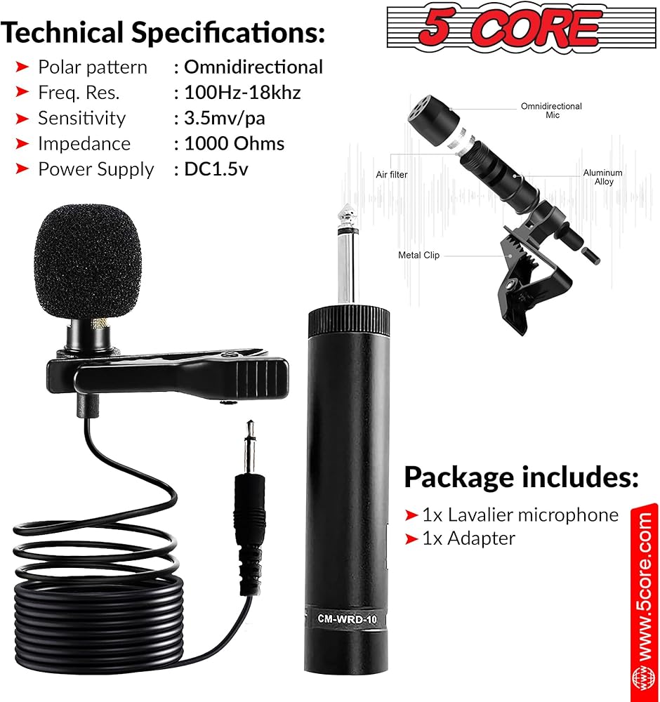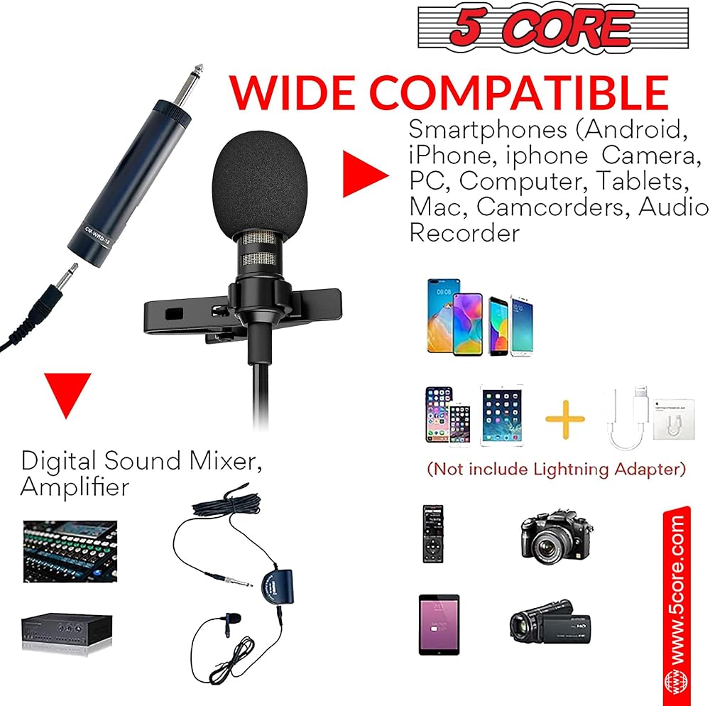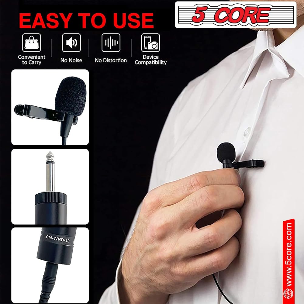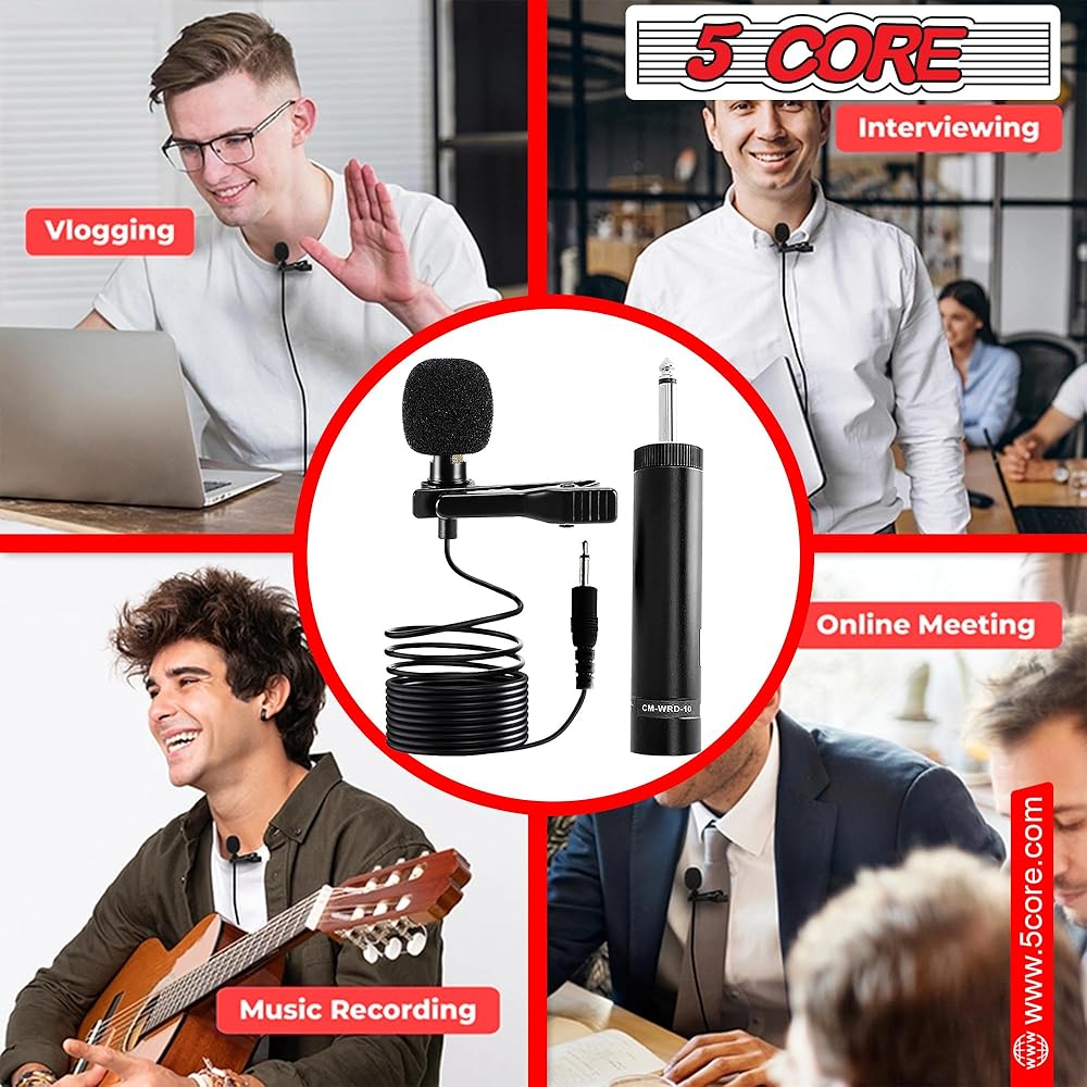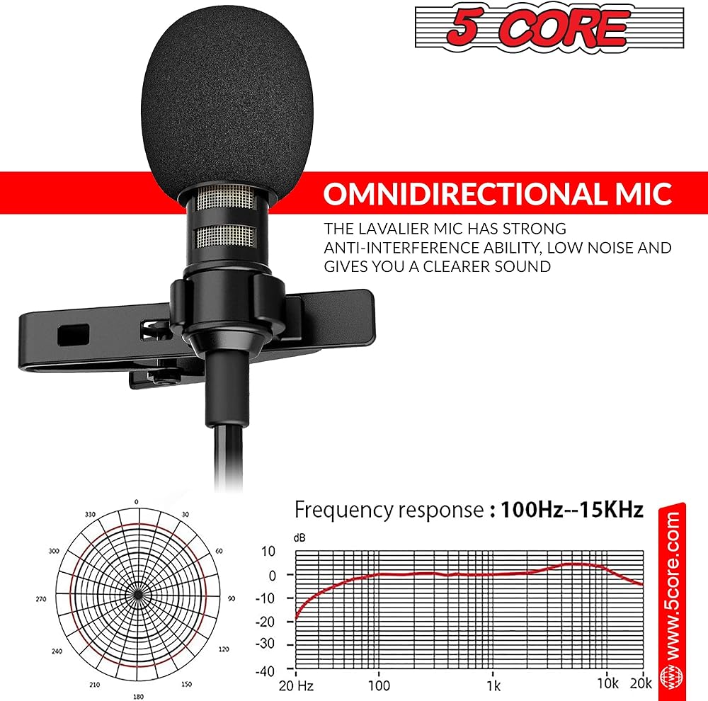 ميكروفون سلكي صغير مزود بمشبك من 5 CORE Premium Lavalier مع ميكروفونات مكثفة متعددة الاتجاهات للبث والتسجيل ومدونات الفيديو والأندرويد والهواتف الذكية وكاميرات DSLR والكاميرا والكمبيوتر والكمبيوتر المحمول