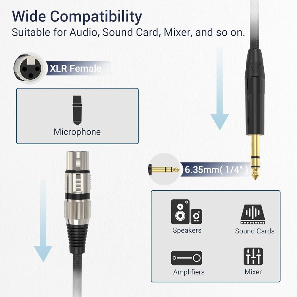 【كابل XLR أنثى إلى 1/4 بوصة TRS 】 مصمم لتوفير الراحة، يتميز هذا الكابل بموصل أنثى XLR على أحد الطرفين وموصل TRS مقاس 1/4 بوصة (6.35 مم) على الطرف الآخر، مما يوفر تعدد الاستخدامات لمعدات الصوت المختلفة.