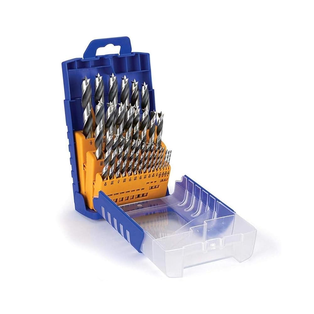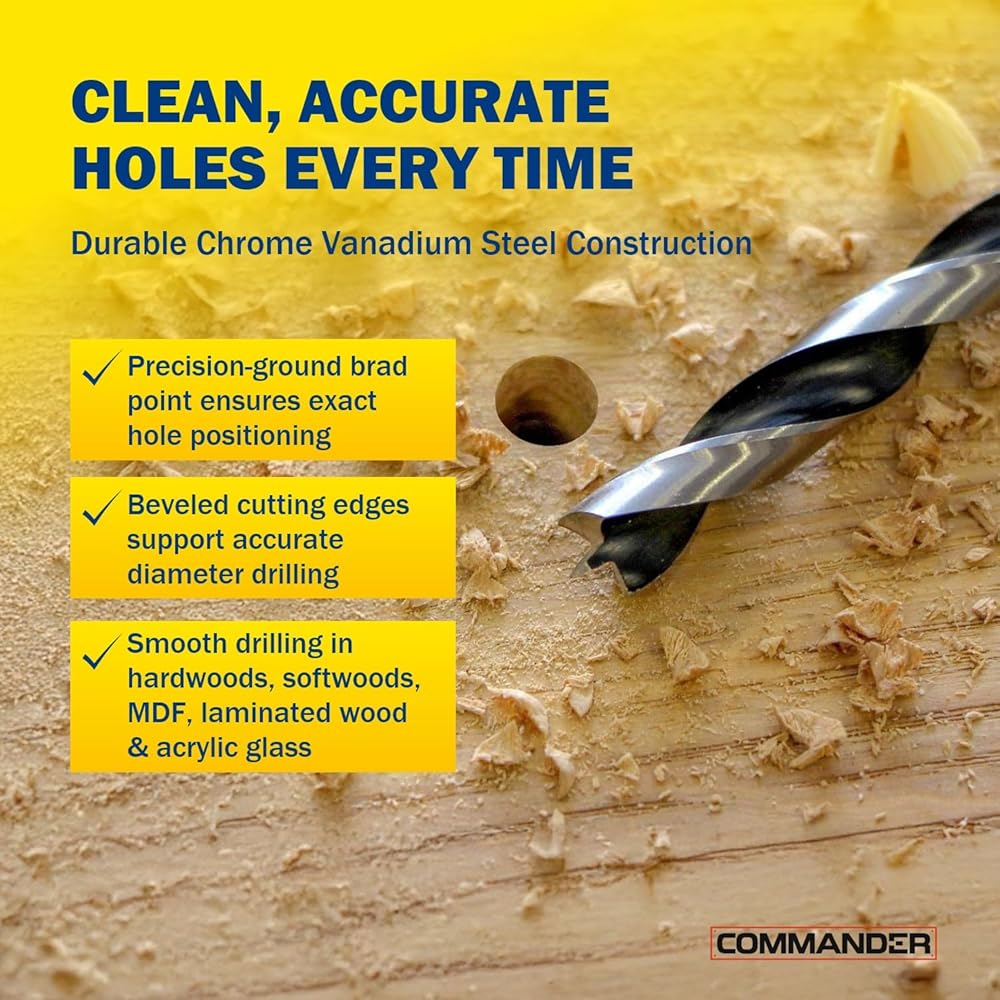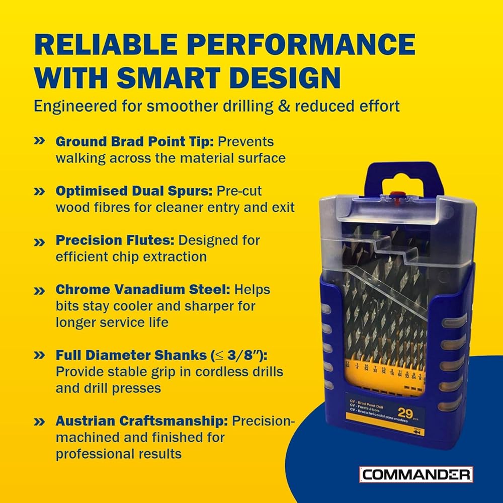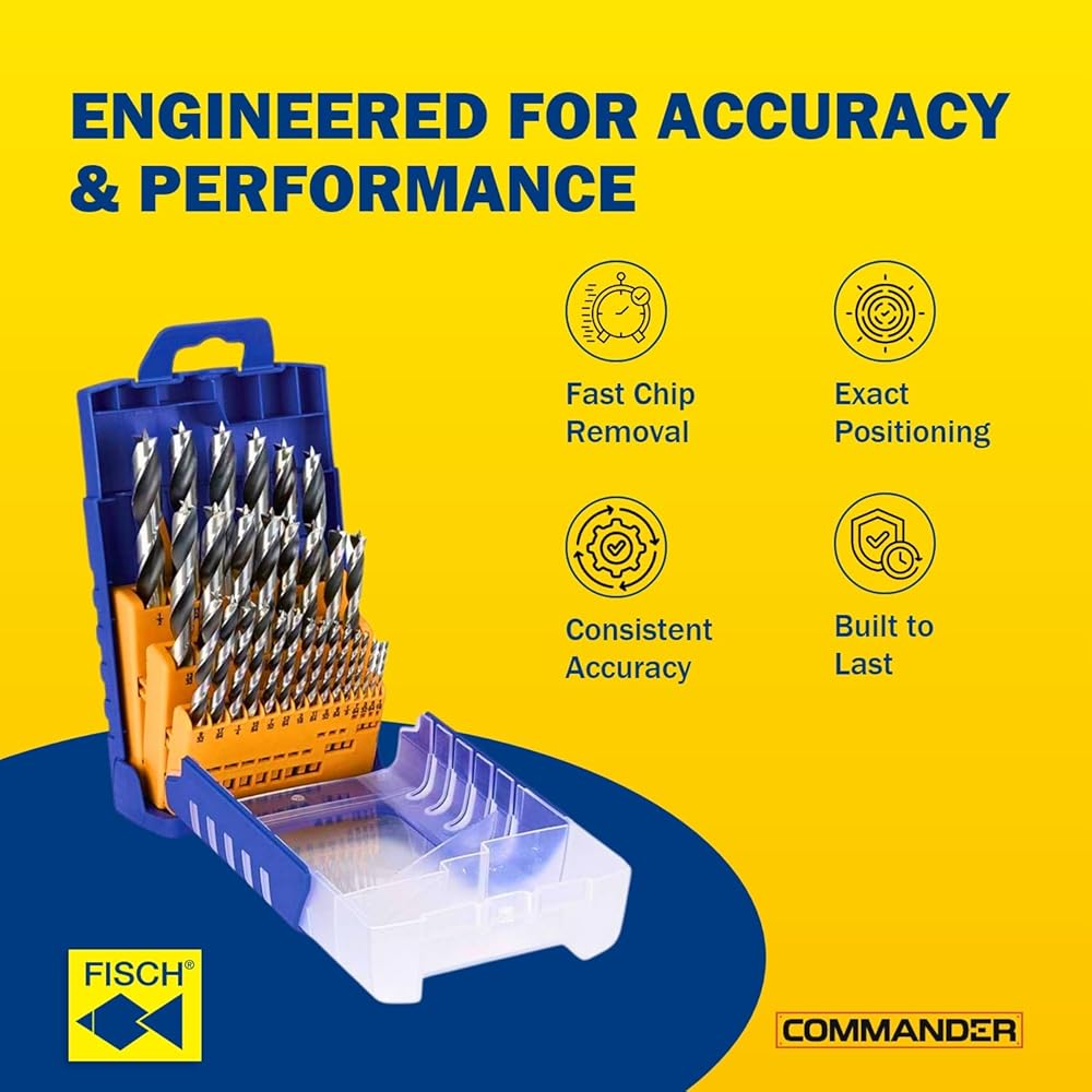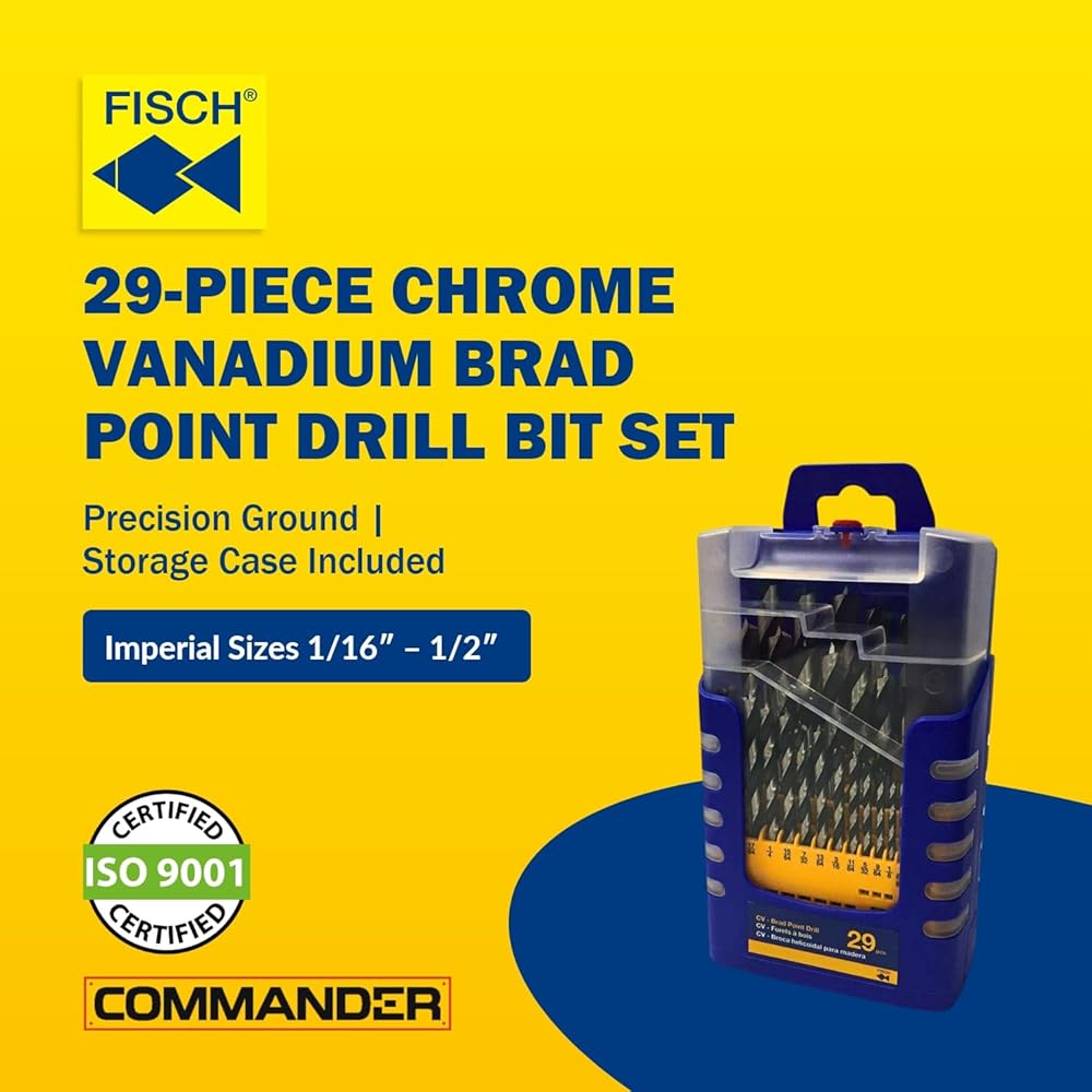 Fisch chrome vanadium Imperial 29 piece brad point drill bit set is great for normal drilling operations in soft and hard wood using cordless drills or drill press machines. Optimal drilling speeds vary from 2,000 to 3,000 RPM. This 29 piece set is the perfect place to start when you need a quality drill set that will get the job done and give you years of service. This handy set includes common Imperial (Inch/fractions) sizes from 1/16” to ½” in 1/64” increments. The drill bits have full diameter shanks on bits that are 3/8” diameter and smaller. The set is housed in a quality plastic stand case that protects your drills and puts them at arm's reach when it is time to get to work.